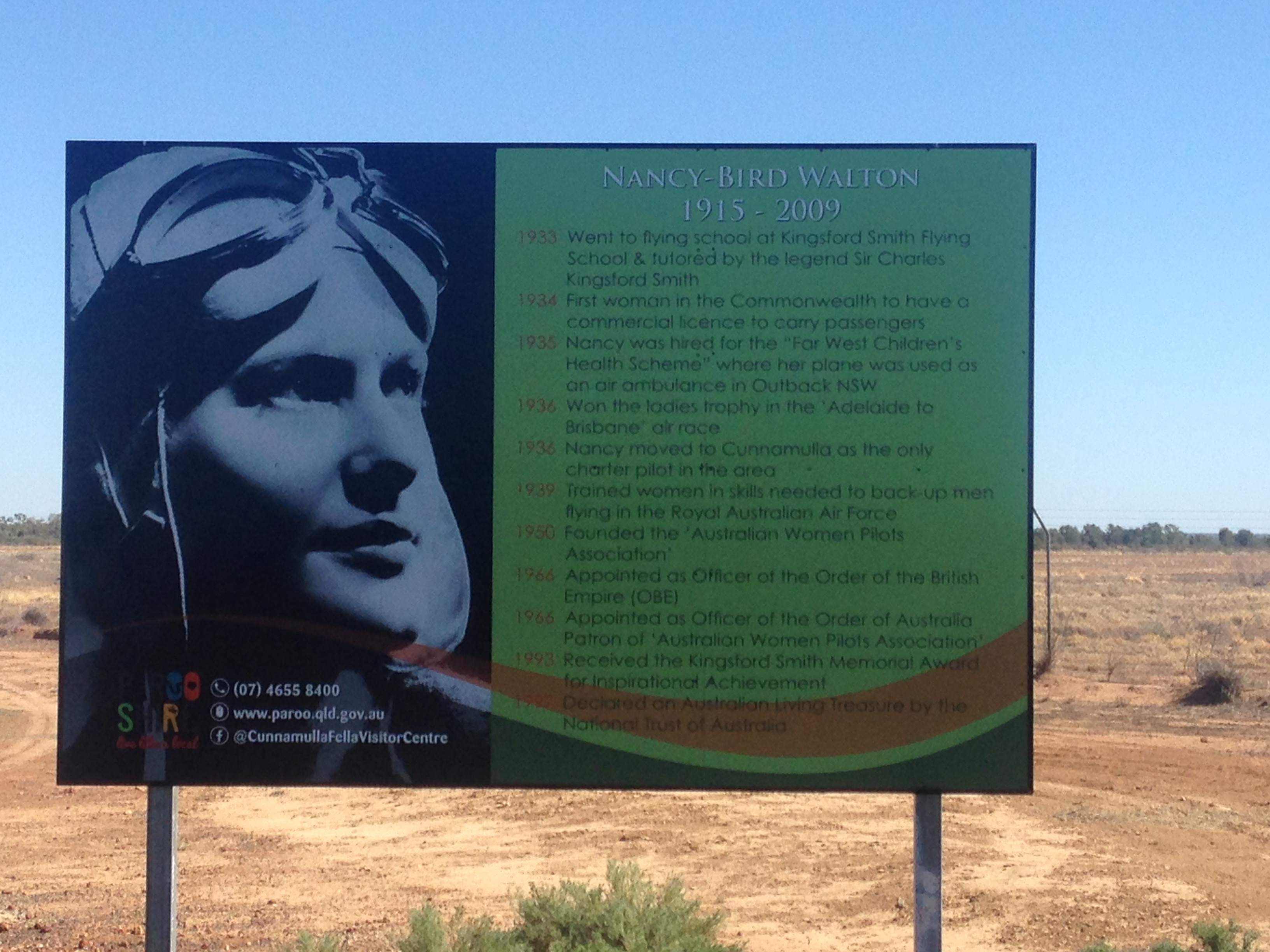 At the airport we noticed a large billboard that described the life of Nancy Bird Walton, one of Australia’s pioneer aviators. She worked in Cunnamulla as a charter pilot for a while and founded the Australian Women Pilots Association.