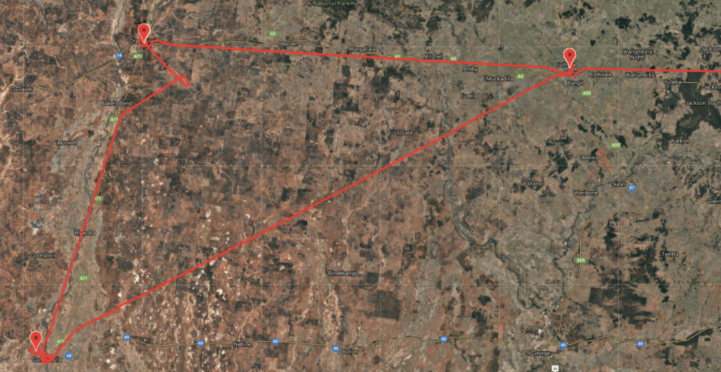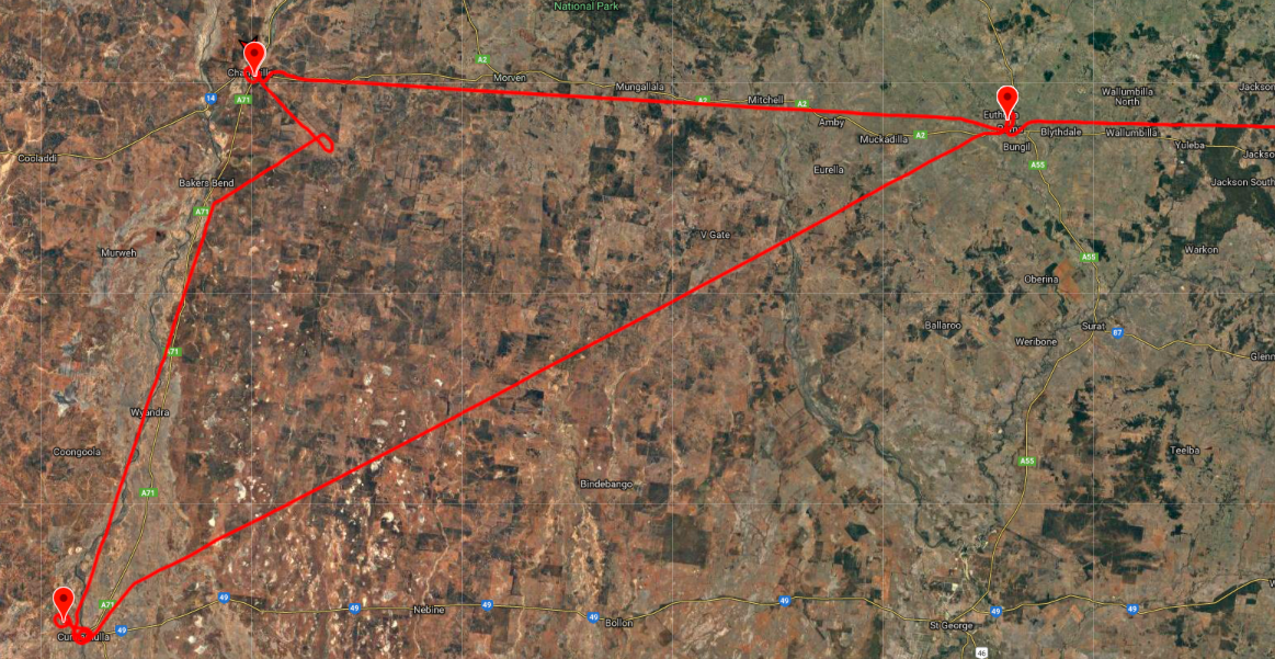 We loaded up and headed off for Charleville, about 40 minutes away. On departure we orbited over Cunnamulla at 2000 ft to wave to the locals and take a few photos then followed the road and the Warrego River northwards.
