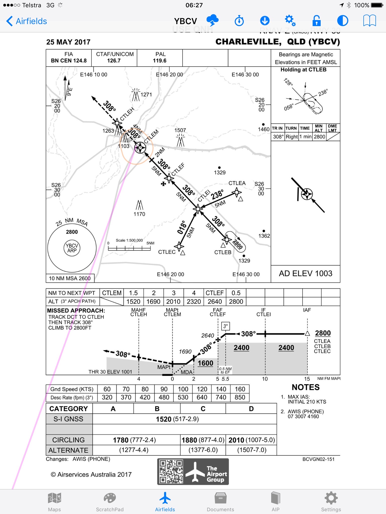 Although there wasn’t a cloud in the sky I wanted to practise an instrument approach as this is something a private IFR pilot must practise at least once every 6 months and more frequently if possible. It helps you prepare for a real one in cloud when required. So I prepared to fly via the RWY31 RNAV. This meant diverting northeast when we were 25 miles out from Charleville and descending to 2800ft for the initial waypoint. I used the autopilot on the Cirrus to hold us at 2800 while using the heading mode to manually fly a holding pattern at EB. We then continued past waypoint EB and EI to EF, where we started descending at 500ft/min until we were about 3 miles from the threshold. I then broke off from the straight in approach and did a circling approach and landed into the wind on RWY 13.