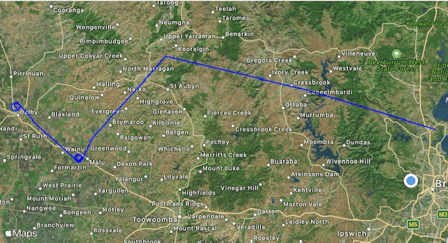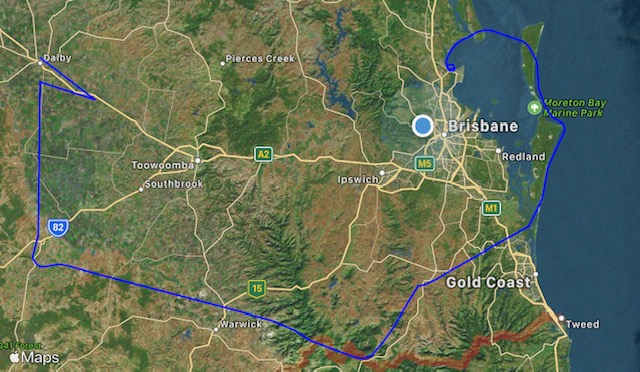 The idea was avoid the Wellcamp training area used by Qantas trainee pilots by flying south from Dalby and then turning east at its southern extremity. We didn’t hear any chatter on the radio in the vicinity but I thought it’d be good to avoid the “danger zone” just in case.