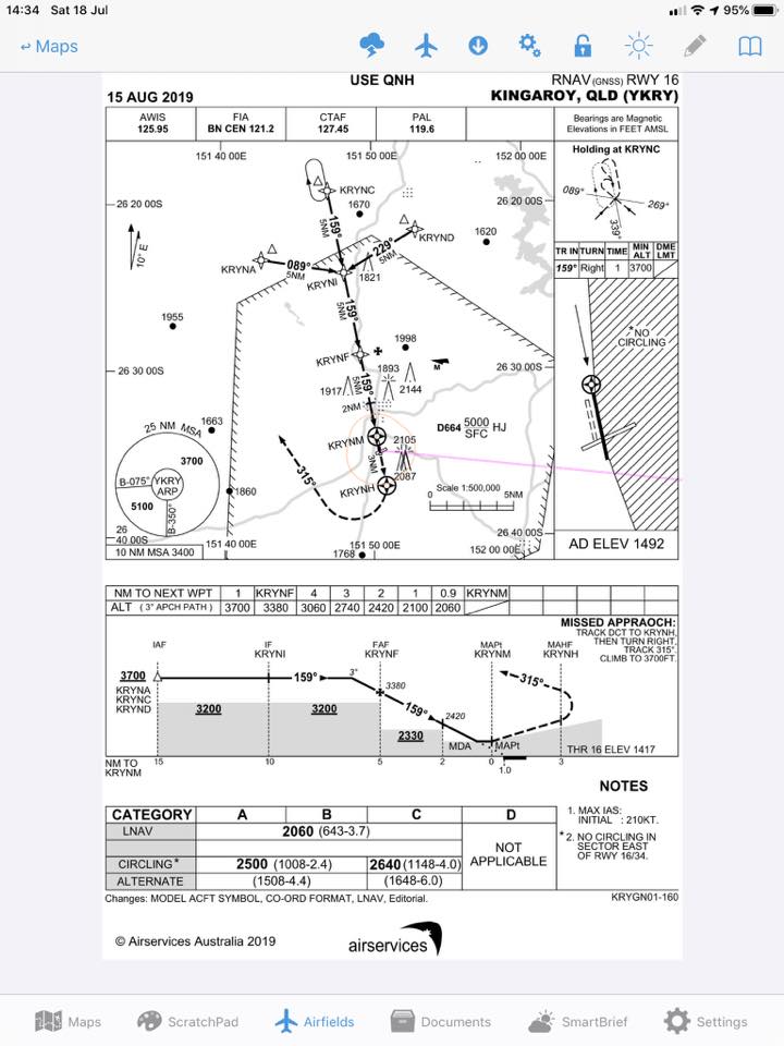 At 25 miles from Kingaroy I tracked straight to waypoint SE on the RNAV for RWY34, did a sector entry and hold and heard on the radio that another pilot was doing the instrument approach from the other direction for RWY 16. We’d have to ensure we didn’t conflict with one another.