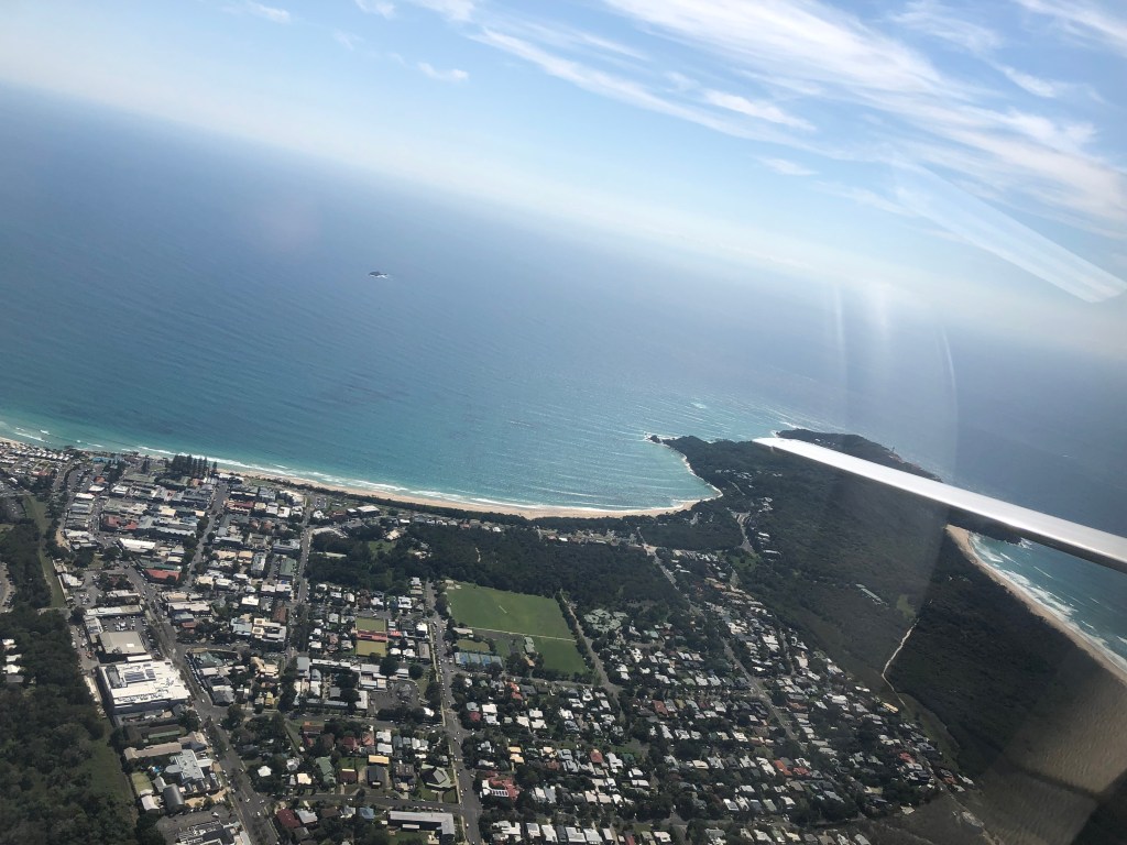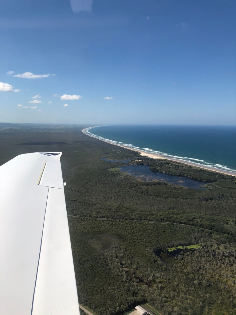 We flew VFR on the way down, passing over Moreton Island, Straddie, and the Gold Coast, obtaining our clearance abeam Q1 and following the coast as far as Byron Bay, where we cut inland to Lismore to land and top up with fuel.