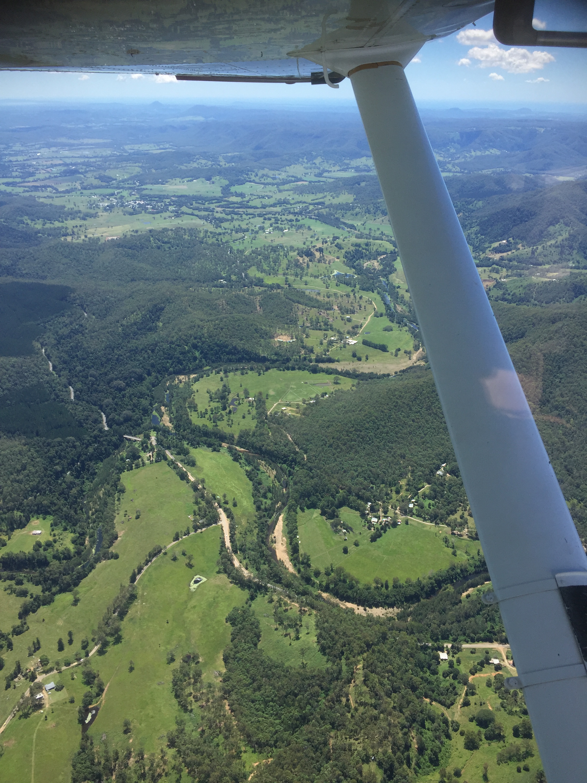 Then it was time to depart again, this time to the north, following the Brisbane River (which meanders its way around Watts Bridge) to its source. The upper reaches are not easy to pick so it was a useful navigation exercise with my crew assisting with spotting duties. Eventually we exhausted the Brisbane River and flew over the hills to the Mary Valley and its lush green pastures.