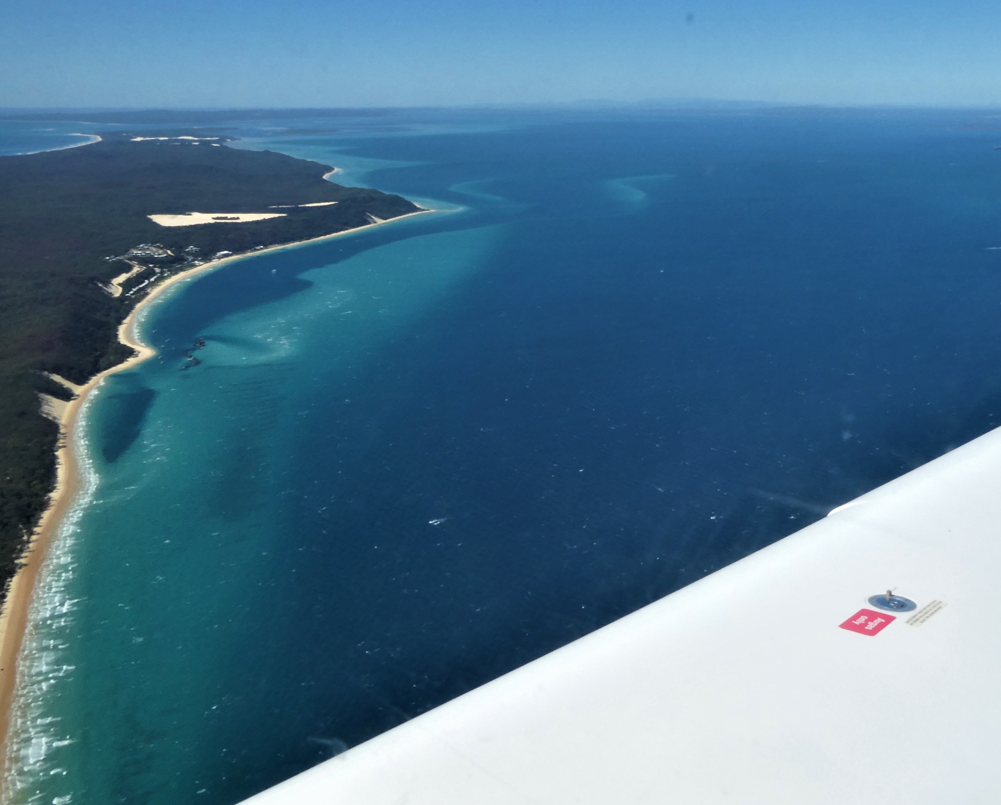 Taking off on RWY25 into a strong westerly wind, we followed the coast to Woorim on Bribie Island then crossed the bay to overhead the Tangalooma Resort on the west coast of Moreton Island.