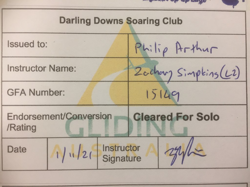 I did 8 flights with Zac and after I’d demonstrated a few good landings in a row he said “well do exactly the same thing again but this time without the big fat bastard in the back seat”. It was time to go solo. My initial response of “oh, no!” caused some consternation for Zac but once he realised that I was half joking and that I did actually feel confident to be able to go solo he got out.