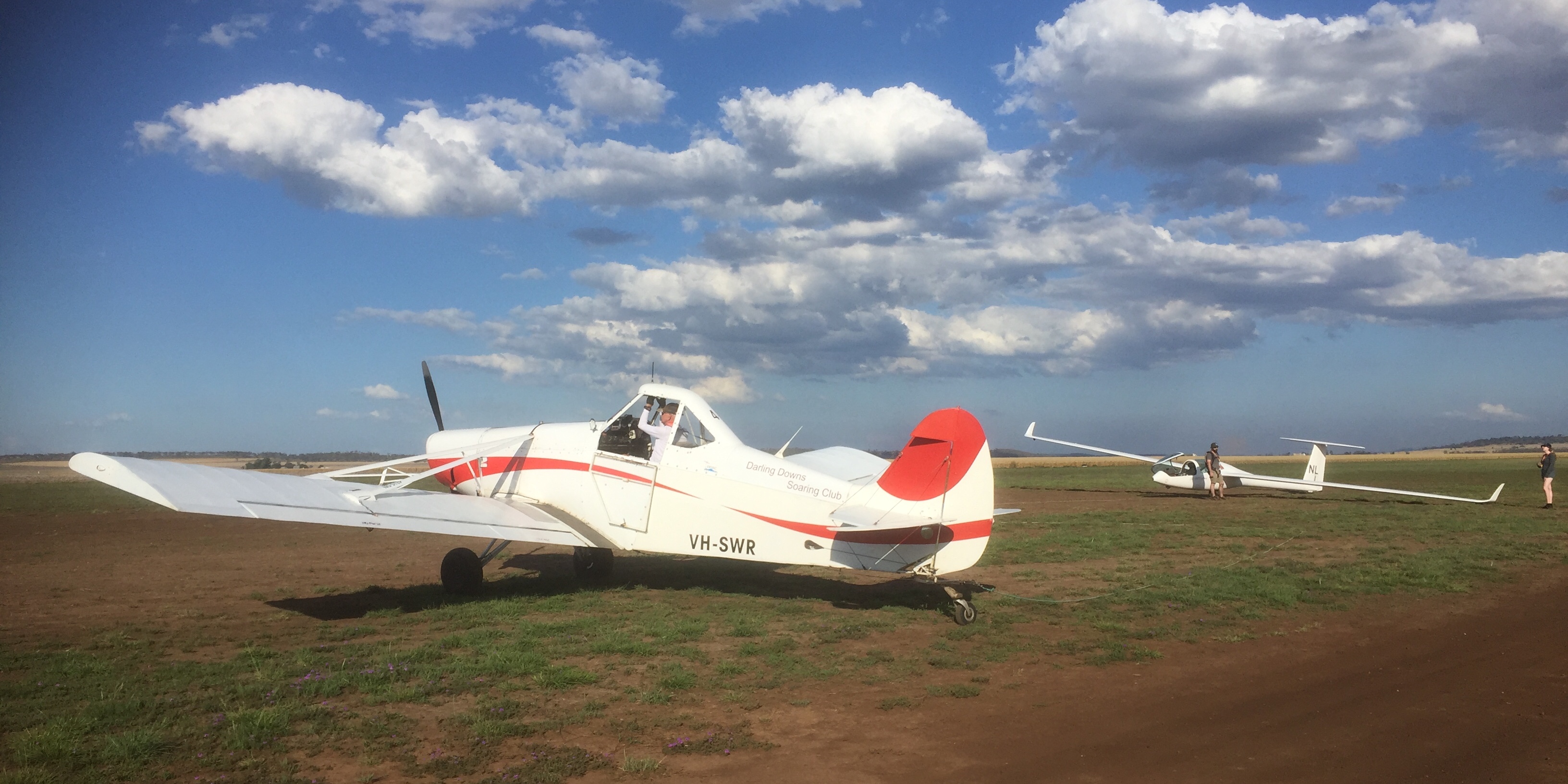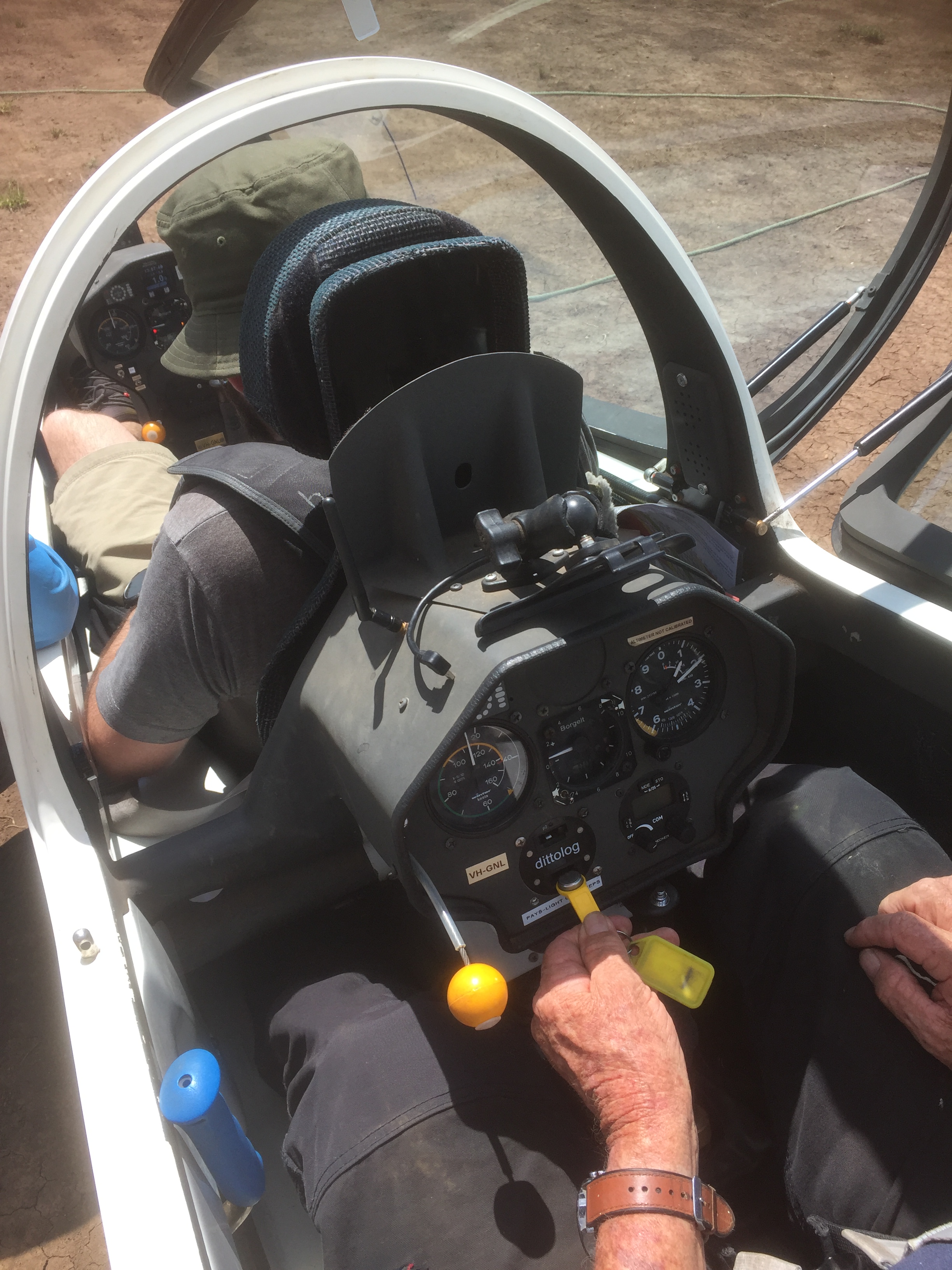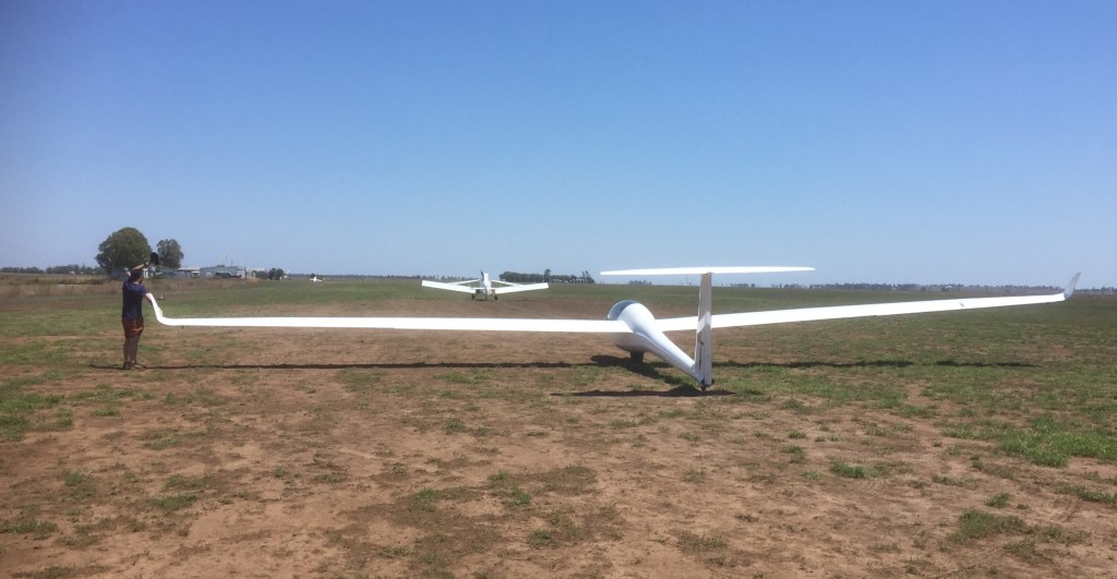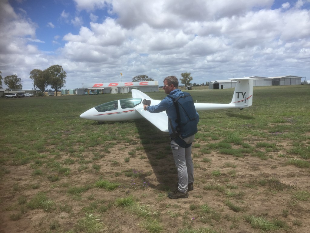 We were in tandem gliders and Oscar and I were allocated to Zac while Monique and Jonathan were with Bob. Each pair would take turns at flying and ground crewing. The tug plane was a Piper Pawnee. According to Wikipedia: “The PA-25 Pawnee is an agricultural aircraft produced by Piper Aircraft between 1959 and 1981. It remains a widely used aircraft in agricultural spraying and is also used as a tow plane, or tug, for launching gliders or for towing banners.” The DDSC has two of them. They are “tail draggers” as opposed to the tricycle undercarriage aircraft that I’m used to flying. They are notoriously more difficult to control when taxiing and during take-off and landing, as their centre of gravity is behind the main wheels and so have a tendency to want to spin around the CofG if not controlled carefully. These were previously used for crop spraying or “dusting” with fertiliser so have a massive nose in which the products were stored.