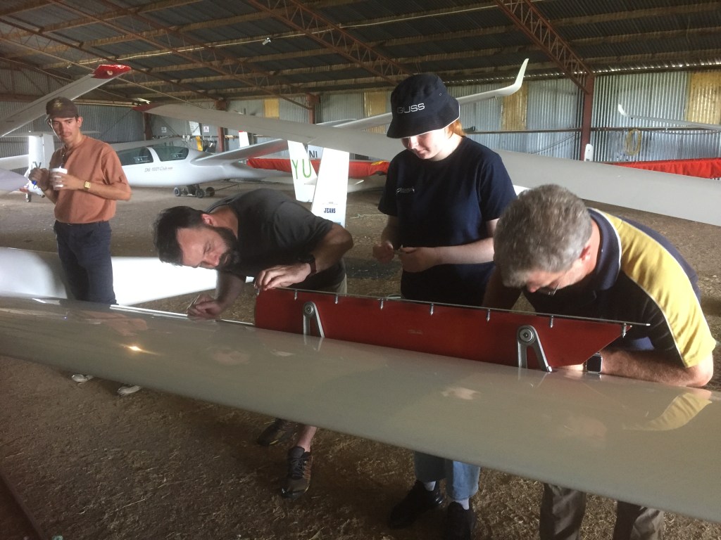 Wednesday started with a couple of Powerpoint lectures covering ground handling, signals between pilots, ground crew and tug pilots, cleaning of gliders and other preflight preparation, and primary and secondary effects of controls. The fourth student turned up half way through the morning and joined in. Jonathan was an engineer who had worked in the petroleum industry around the world for many years and during the quiet time brought on by COVID decided to have a go at gliding. He’d learned to fly a few years ago and had done some taildragger and aerobatic training along with his PPL.