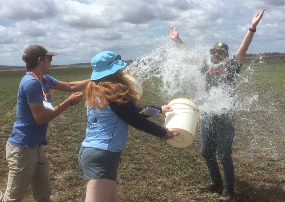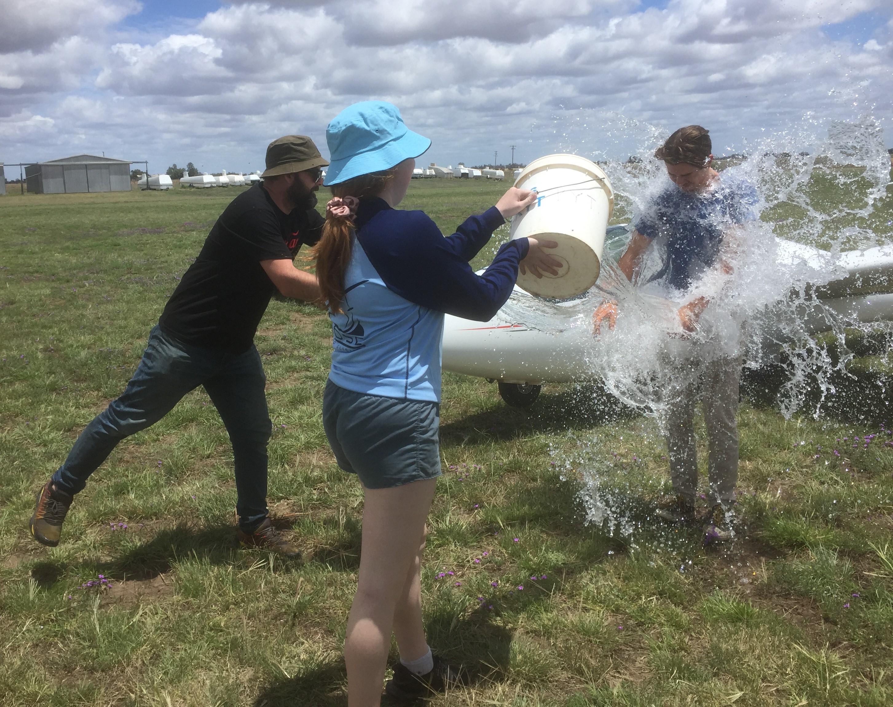 Bob congratulates Jonathan after his first soloBuckets of water for JonathanJonathan gets wetZac steadies the wing as Oscar prepares to take off on his first soloOscar’s drenching after his first solo