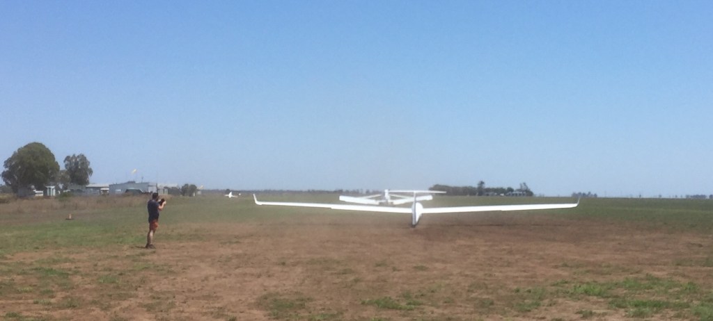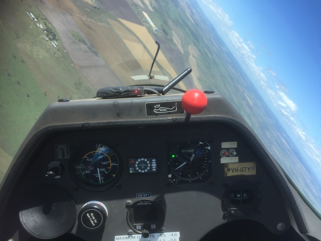 On Thursday I did five flights. We covered quite a few topics including flying accurate circuits, thermalling, stalls, incipient spins, steep turns, landing/flares, transitioning from high tow position to low tow position, and flying in low tow. Our tug pilot was Alain, a lovely 75-year-old French guy who has lived in Australia for decades and has thousands of hours of glider flying, instruction and tug piloting behind him.