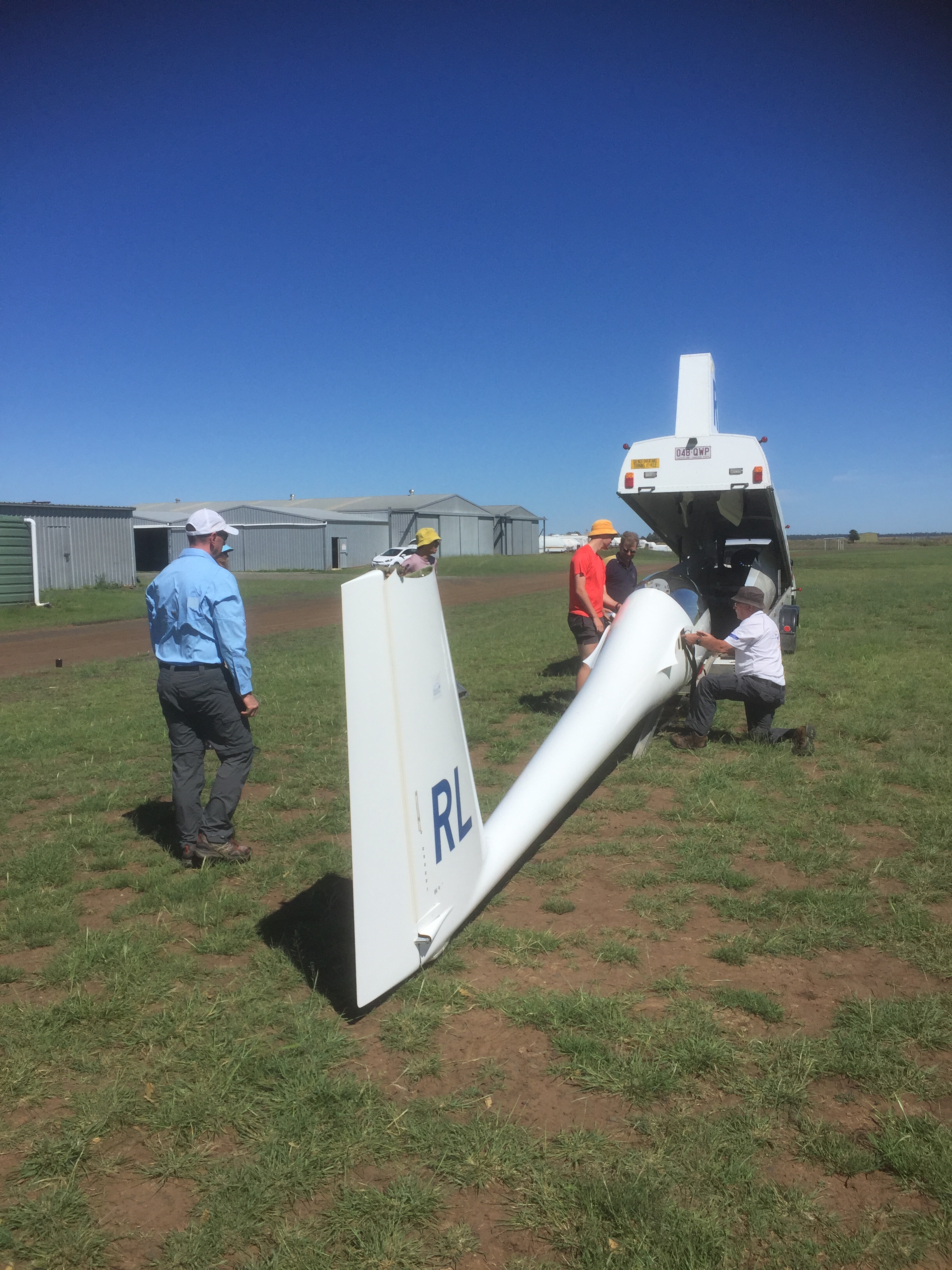 Saturday dawned and the sky was clear but the strip was still wet. Alain was not too sure we’d be able to fly as the ground can be very sticky if it’s too wet. Being the weekend there were more club members around. We helped with the dismantling of the wings off one of the gliders that had to be taken away for a service, and saw how it was loaded into the trailer for transporting.