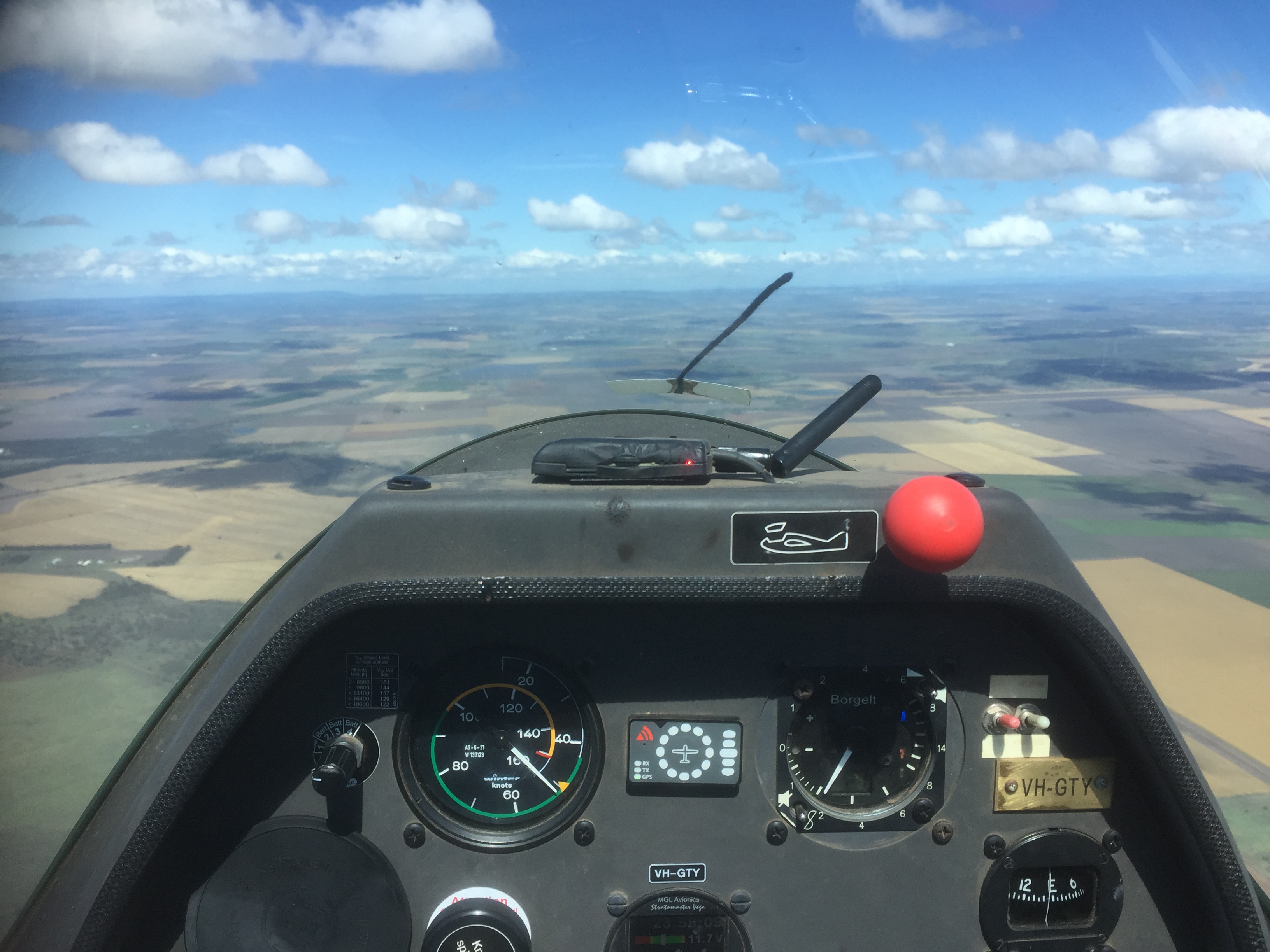 During the theory lessons Zac covered lookout and scan procedures while Bob talked about the art of thermalling. He stressed how you need to “feel” the thermals through the motion of the winds and the fuselage. There is an instrument called a “vario” that measures the rate of climb or descent of the glider through a device called a “total energy meter” but the vario lags reality by a couple of seconds so if you rely on the vario alone you will always be chasing the tail end of the thermals. Hence the need to “feel” the thermals as they buffet the glider.