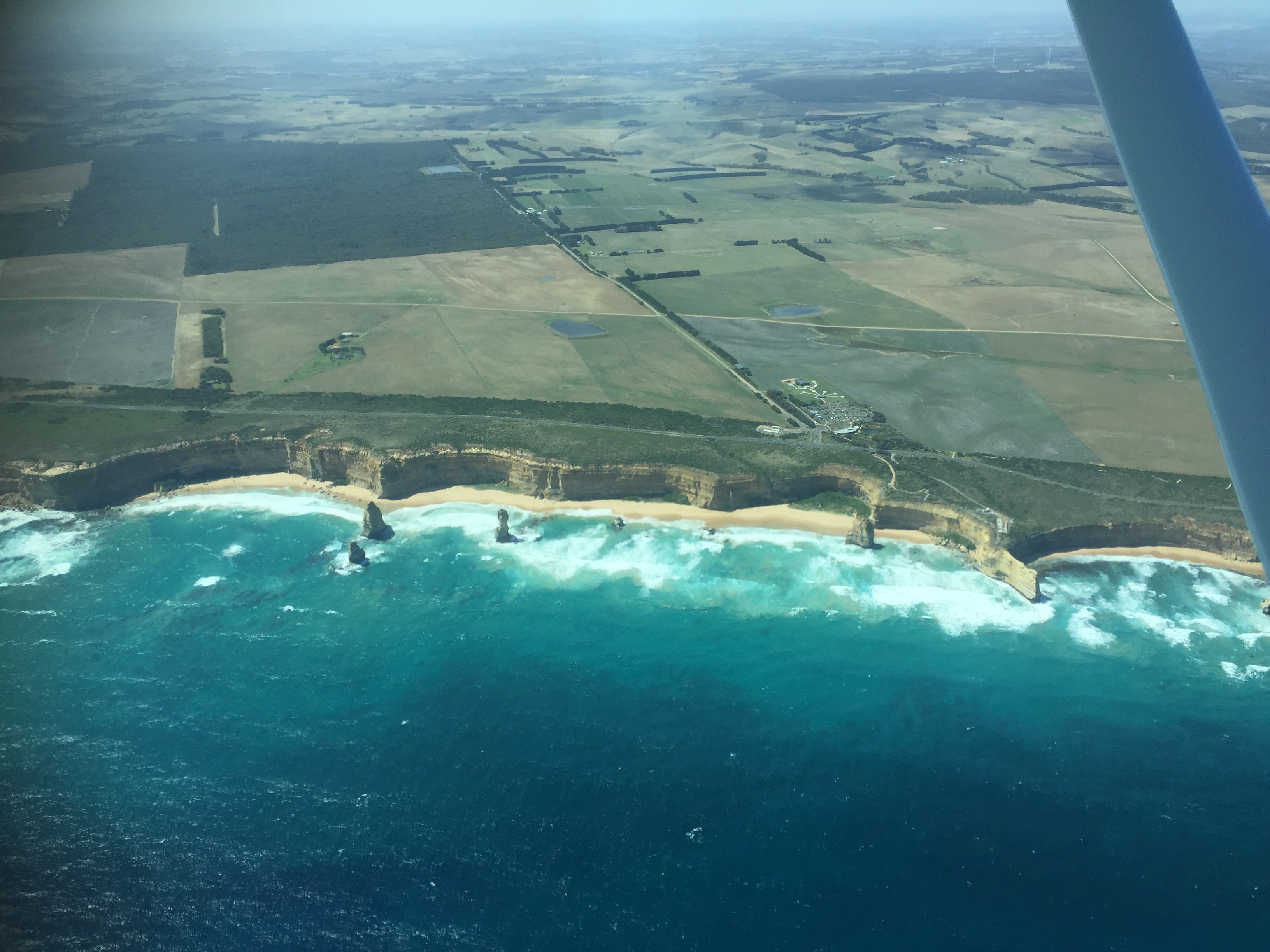The effect of the pounding waves is having its effect on the outcrops. We decided that although they still look impressive from 3000 ft that they probably look more imposing from the top of the cliffs. And yes, there are only 7 of the 12 apostles left.