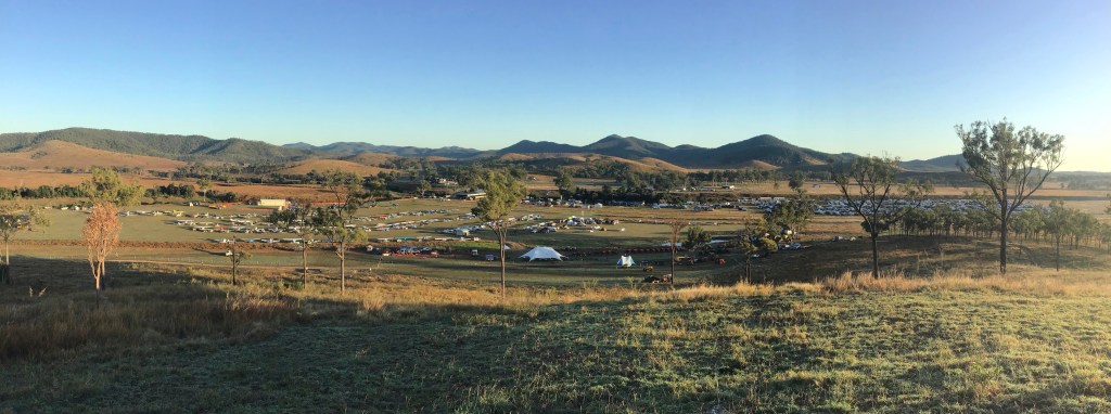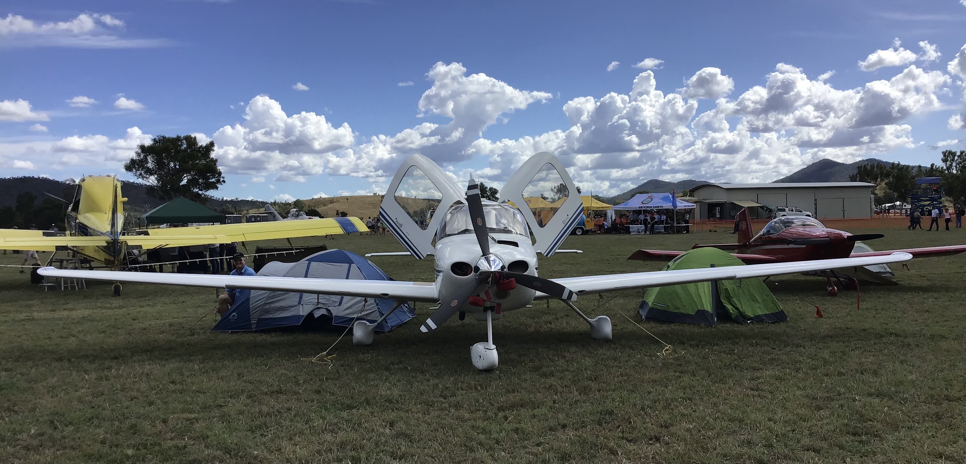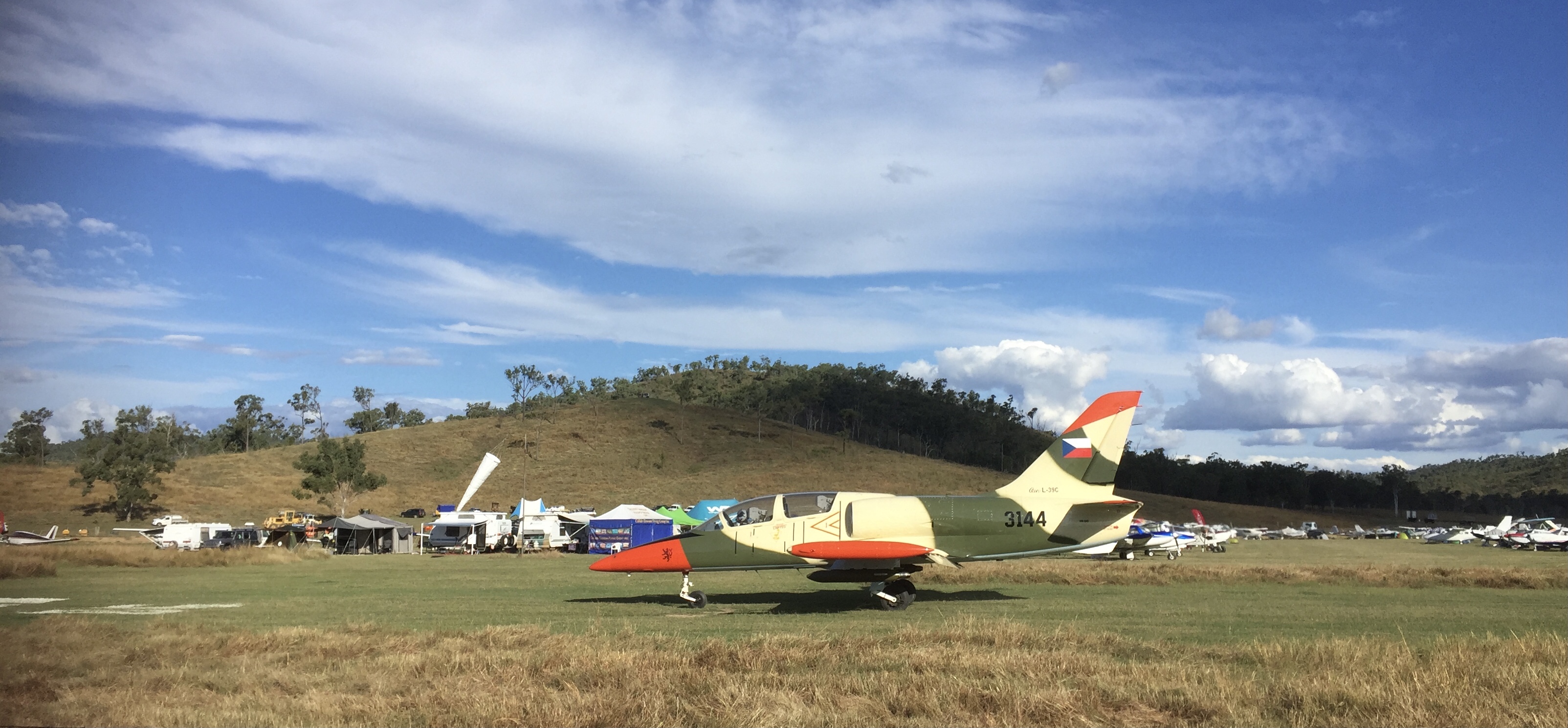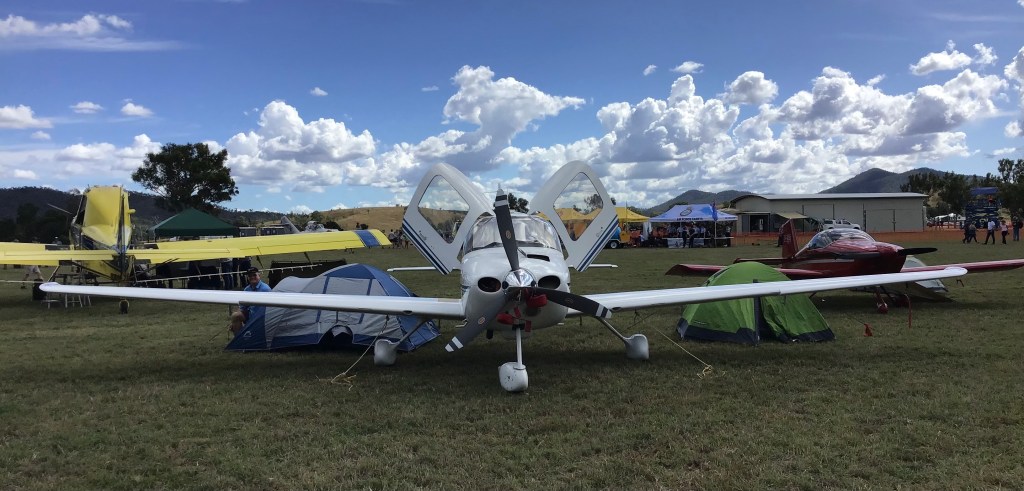 I’d noticed an inconsistency in the CTAF frequency announced for the Old Station. The Flyin website said we should use 132.2 MHz while the OzRunways guide said it should be 126.7. So I downgraded to VFR so I could monitor both frequencies simultaneously on my two radios, asking ATC for a SARTIME before I switched off their frequency. As it turned out, there was only one other aircraft in the circuit with us and we followed him in on runway 06. As we flew downwind we could see that there was already a large number of aircraft parked in the paddock and a huge crowd along the end and edge of the runway. It was a little bit unnerving on short final as I noticed that there were literally hundreds of people lined up watching every plane land. “Don’t mess up this landing” went through my head – there are too many witnesses. With almost no wind and perfect conditions what could go wrong and it was a greaser of a landing. We turned off the runway, cancelled our SARTIME with Brisbane Centre (the mobile service is not great there) and taxied towards the parking area, switching to the ground frequency that was displayed clearly for all to see. A parking assistant manning a portable VHF radio directed us to a “follow me” car that we followed to our designated parking spot at the far end of the paddock and shut down. It appeared that most people had arrived the day before and that’s why it was so quiet flying in. As a result our parking spot was quite a long way away from the runway. Never mind, at least it’d be quiet at night.