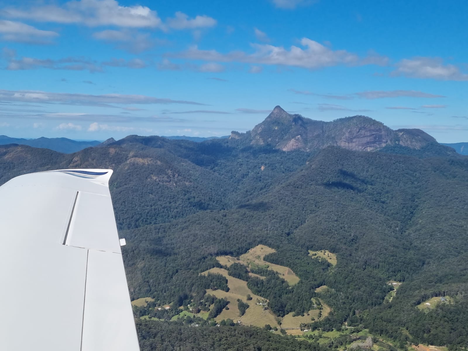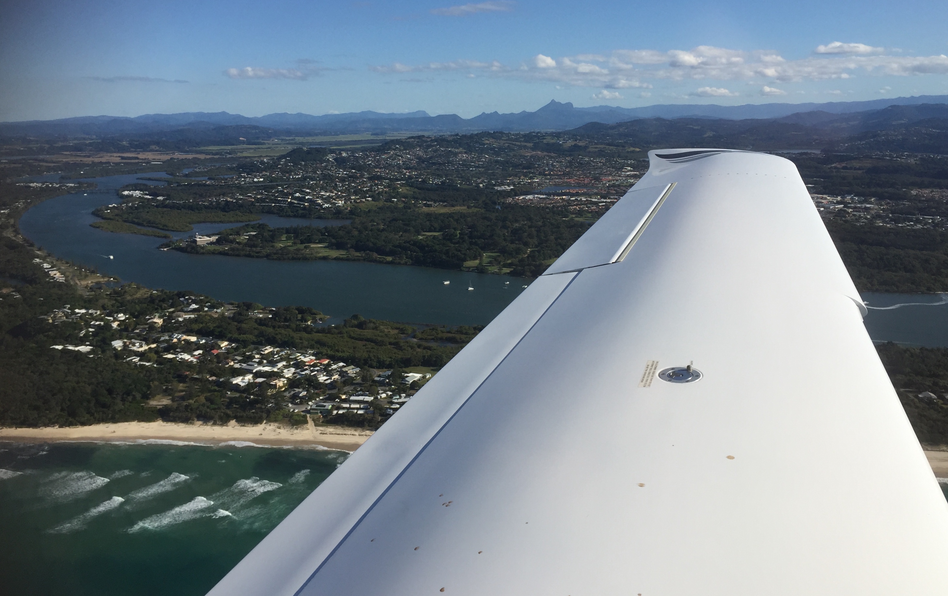 One of the most scenic flights in this part of the world is to follow the NSW/Queensland border from the coast to the west through the area called the Border Ranges. It’s full of the remnants of volcanos including one which has as its centre a volcanic plug, called Mount Warning. The caldera that surrounds it forms numerous cliffs and valleys, much of which is still wilderness but there’s also miles and miles of rolling farmland with villages and towns scattered around. I’ve loved flying there since I first went on an early cross country flight with an instructor out of Redcliffe. The town of Murwillumbah is at the foot of Mt Warning, on the banks of the Tweed River, that winds its way through farms and sugarcane fields on its way to Tweed Heads and the Gold Coast. Whether you want to see spectacular mountains, cliffs, beaches, rivers, skyscrapers, lakes this border ranges have it all, packed into a very compact area. We’ve spent many holidays at the beach just south of the border and have climbed Mt Warning on three occasions (when it was still permitted) and have friends who’ve built an amazing house on a hill called “Round Mountain” nearby. So we love to visit the area. And you know what? There’s an airfield at Murwillumbah so we can actually fly there and land.