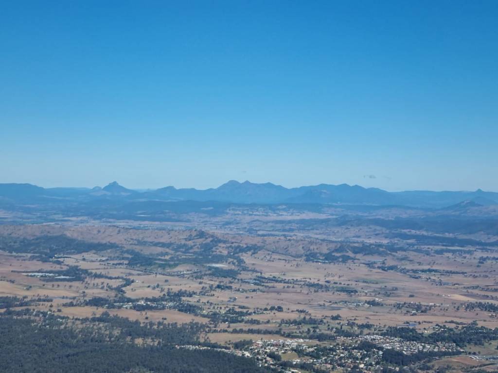 Luc and I topped up the tanks of MSF to about 230 litres to give us sufficient fuel for the flight down, a one hour scenic with Harry and Rianne and the flight back, while not exceeding the MTOW. Then we were off into the wild blue yonder and that’s what it was. Not a cloud in the sky as we flew VFR from Redcliffe via Lake Samsonvale and squeezed between the Archerfield and Amberley controlled airspace then on over Beaudesert towards the Scenic Rim. The Great Dividing Range was visible on the horizon to the west.