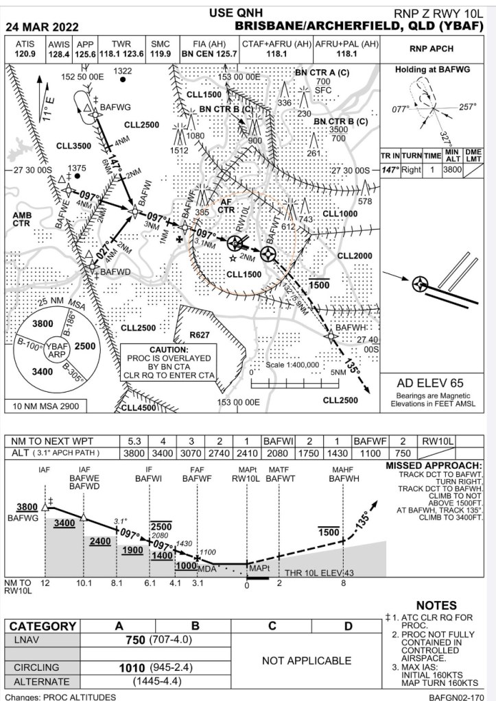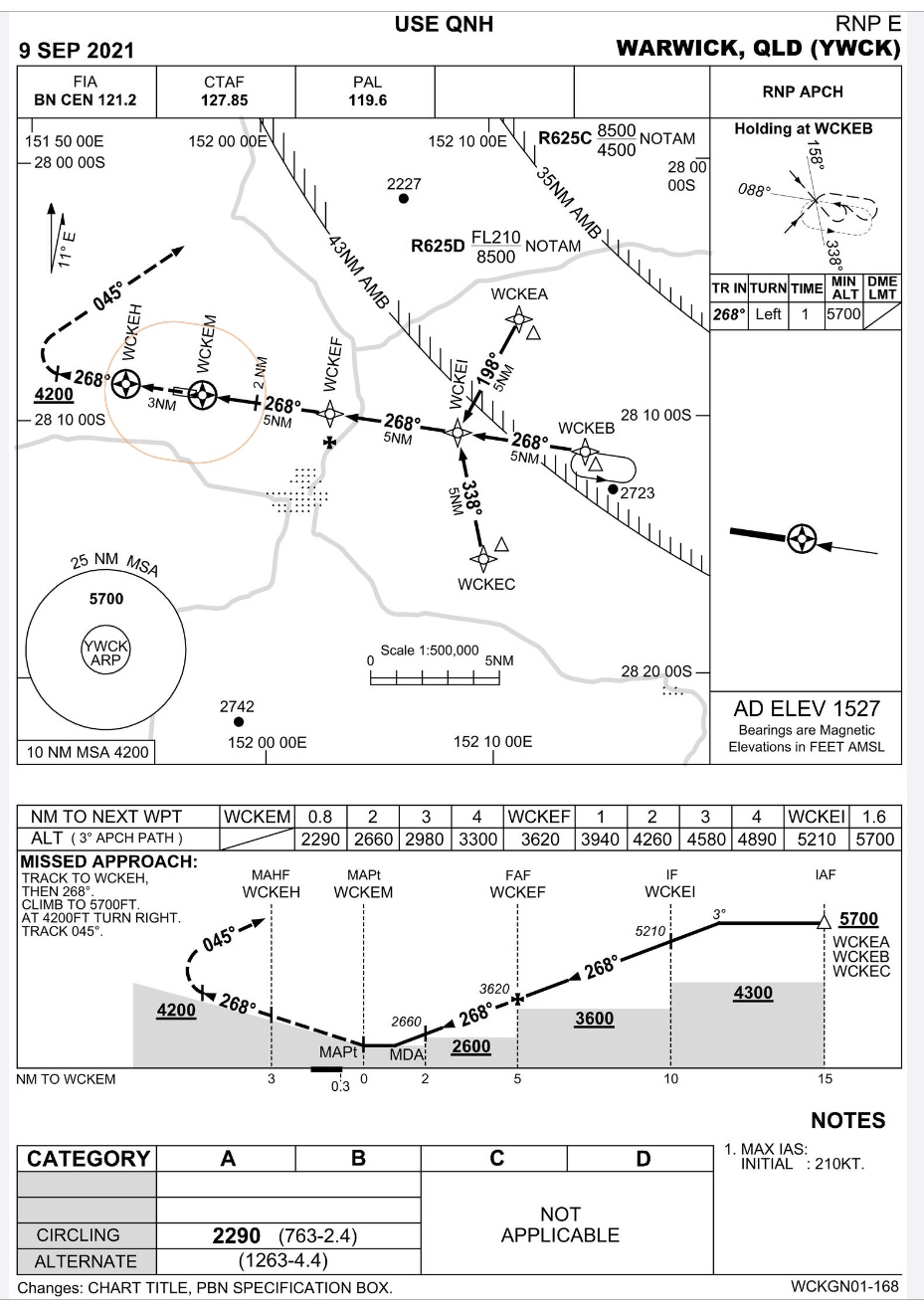 I wanted to fly the Required Navigation Performance (RNP) instrument approach at Warwick so once we were at 6000ft I requested traffic directly to the waypoint Echo Bravo. There was another aircraft completing the same instrument approach ahead of us so it made sense to delay our landing for a few minutes by flying the holding pattern. As we approached the waypoint I went through the “QADCAPS” mnemonic (check QNH, check that the nav Aid is available (the GNSS system uses a system called RAIM to ensure there are sufficient satellites available to provide the necessary accuracy), check the compass and DG agree, brief the Chart (below), confirm the Audio frequencies, use the radio to switch on the Pilot activated runway lights, and reduce Speed to about 120 knots).