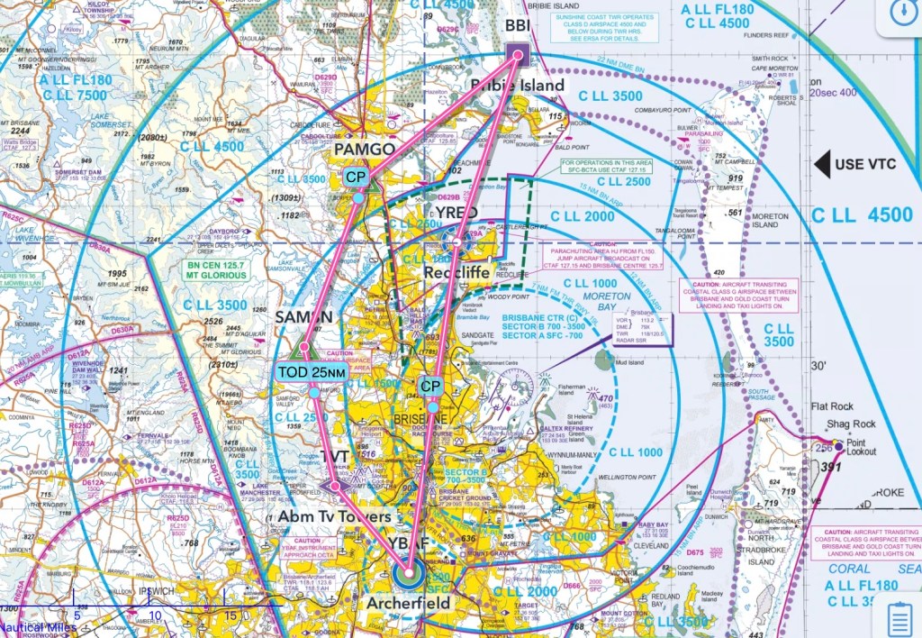 On Wednesday 13th July I was ready for my second flight with Alyce to complete my BFR. This time it would be a day flight so we could undertake some basic flight skill checks and a Standard Instrument Departure (SID). For this flight I planned to fly IFR out of Archerfield via the SID, then fly direct via the controlled airspace over Brisbane to Redcliffe. I’d do a full stop landing and switch to VFR, then conduct a few circuits at Redcliffe, then fly to Bribie Island for some air work, and finally return to Archerfield.