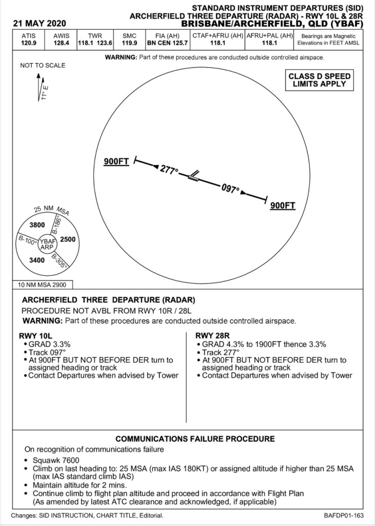 After obtaining a transponder code from Brisbane Centre and a clearance to taxi from Archer Ground we headed for the runway. It was another strong westerly so once again we were directed to the holding point for RWY28R. Archerfield Tower asked us to hold until advised otherwise. This time it was about a 5 minute wait as various other aircraft arrived and departed. At times we couldn’t see any other aircraft in the circuit so I can only presume that there was traffic overhead flying into or out of Brisbane Airport that we had to be separated from. Finally our turn came to line up. We obtained our clearance to take off on and climb to 4000ft on the SID. This SID is called Archer Three Departure (Radar). It requires the pilot to take off and maintain a minimum climb gradient of 4.3% to 1900ft and then 3.3% while tracking 277 degrees until you are at least 900ft AMSL and past the departure end of the runway. These minima ensure that you clear the “obstacles” on Mount Coot-the (TV towers) before turning. Although it was a clear blue sky that day, I could have taken off into cloud with a 300 foot minimum ceiling and if I followed the instructions on the SID chart I’d remain clear of obstacles. The required gradient is equivalent to about 400ft/min at 100knots and the Cirrus can climb at 1000ft/min so there’s no difficulty achieving those minima.