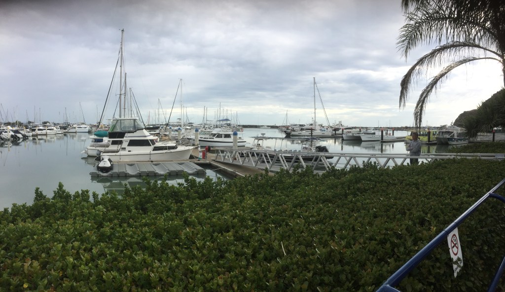 The morning dawned as predicted. Overcast and showers of rain. And Peter emerged from his room with a serious case of food poisoning. It appears one of the prawns on the pizza was off. So we decided on Plan C. We wouldn’t fly that day. Ted and Mark and I headed to Rosslyn Bay for breakfast at the marina while Peter went back to bed.