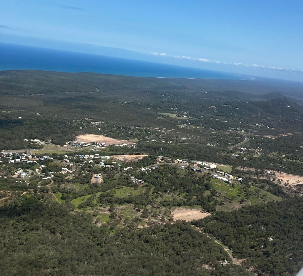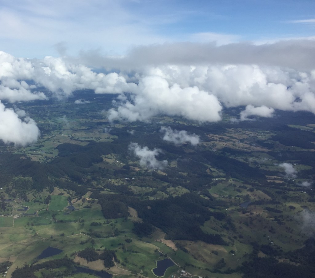Emerging above the clouds we had blue sky above us again but it was not to last. Further north there was a lot of stratus and cumulostratus so were in IMC for about 50 minutes of the trip that lasted just over an hour. The photo below was taken somewhere east of Gympie where there were some holes in the clouds.