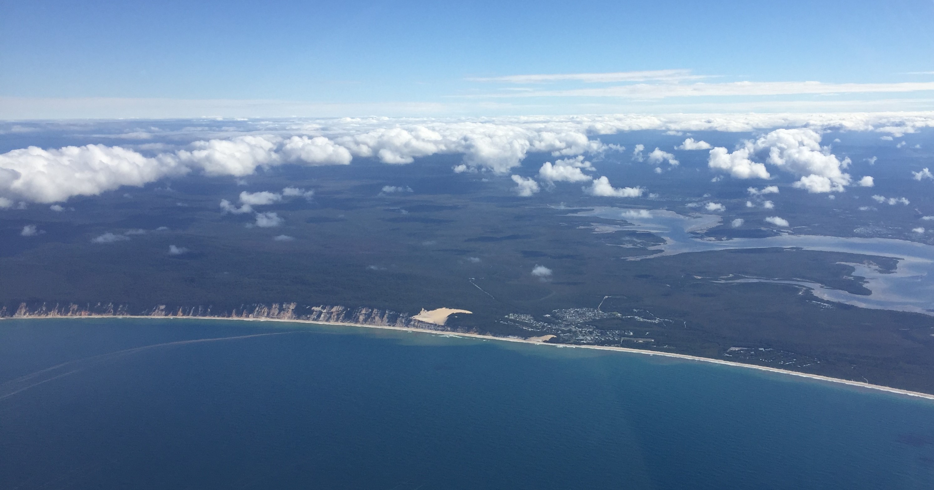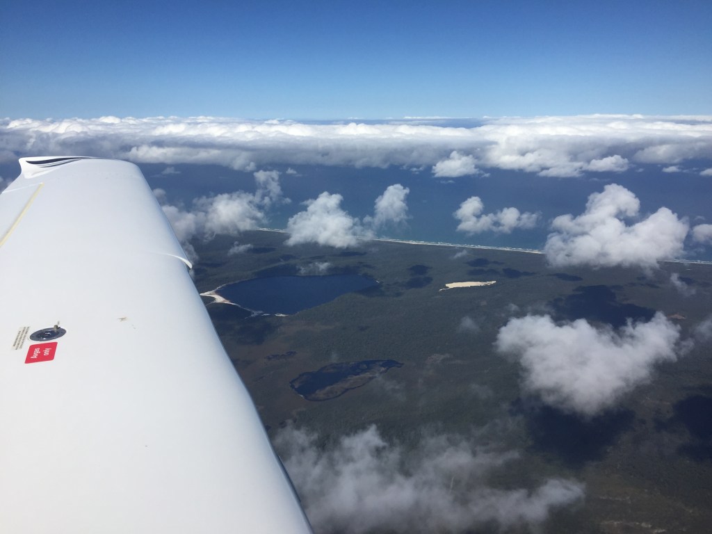 It was clear skies at 7000ft over water past Bundaberg, Bargara, Harvey Bay with scattered stratocumulus over the land. The cloud started to build over Fraser Island and Double Island point, and by the time we reached Noosa it was overcast below us. After a quick descent through the clouds we emerged above Roys Orchards and flew the last few miles to Redcliffe where we had a soft landing, put the plane away and then attended the monthly aeroclub barbecue.