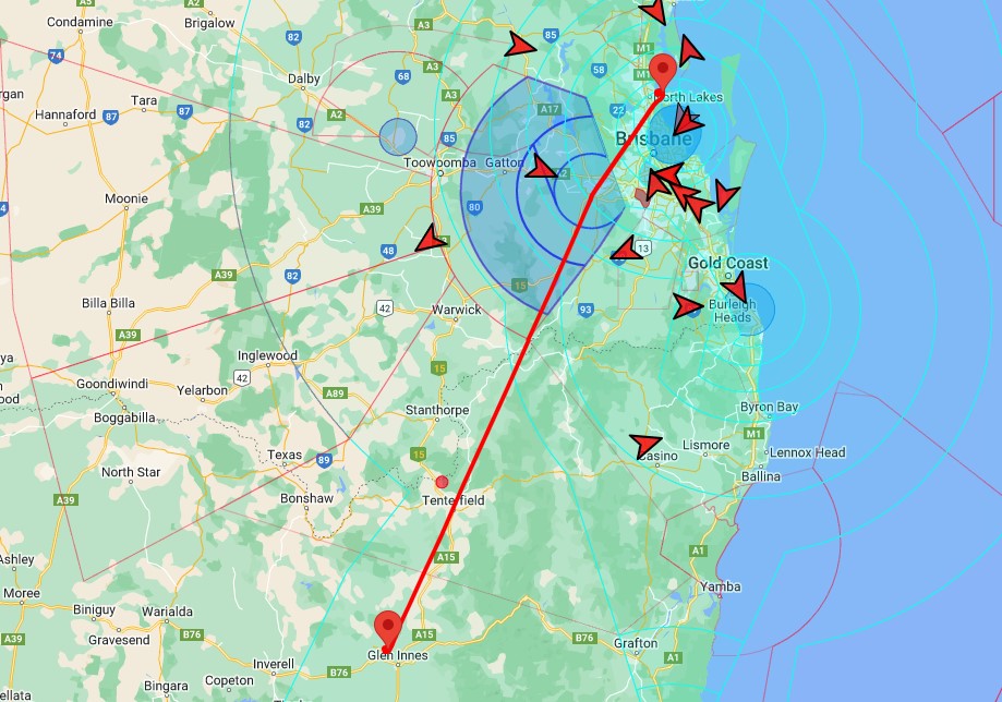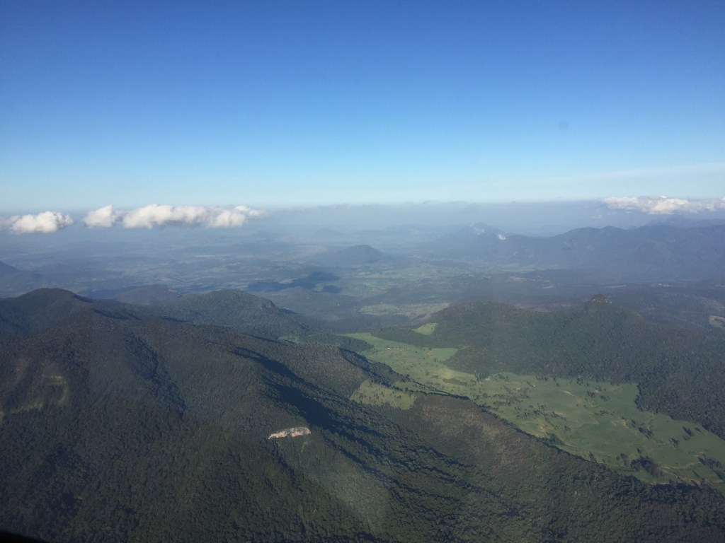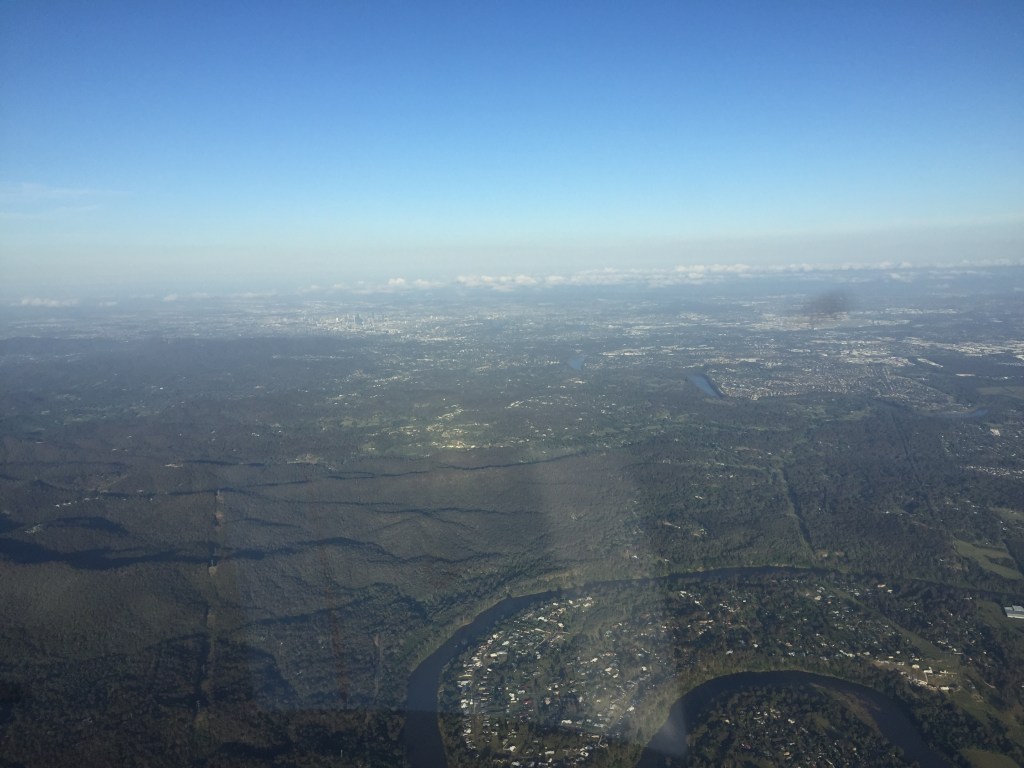 The light from the late afternoon sun was stunning as we passed over the border ranges around Tenterfield and Stanthorpe. Soon we were descending from overhead Amberley and past the winding Brisbane River.