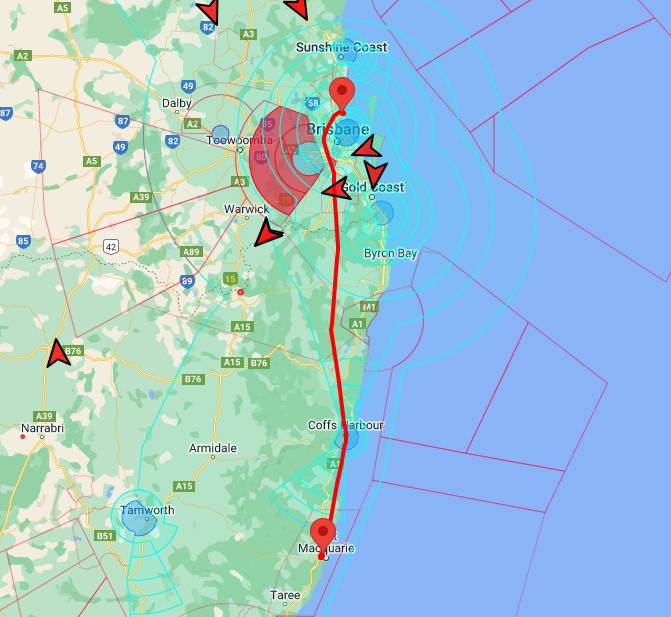 We departed Redcliffe on Thursday 10th November at about 9am. The flight plan I’d prepared originally was to depart IFR at 7000ft over the top of Brisbane airport then track via the Gold Coast and follow the coast to our first fuel stop at Port Macquarie. There were a couple of snags however. First, the RAAF was doing maneuvers and the whole Evans Head restricted area was active so we couldn’t plan or fly through it. So, I submitted a plan via the Gold Coast but around the restricted area. After takeoff however ATC didn’t clear us directly over Brisbane Airport. Instead, we were vectored out over The Gap and between Amberley and Archerfield airspace. This was apparently to avoid Brisbane International traffic. By the time the traffic around Brisbane had been avoided there was no point heading for the Gold Coast anymore, as it would’ve been a roundabout way, so ATC asked whether we wanted to fly direct to Coffs Harbour and we agreed. Even then ATC vectored us well clear of the Evans Head restricted airspace as we passed. Those jets must have been having dog fights. It was fairly cloudy on the way Coffs so views were limited but it started to clear as we progressed, and we had good visual conditions approaching Port Macquarie.