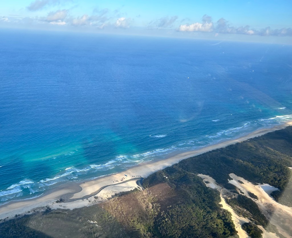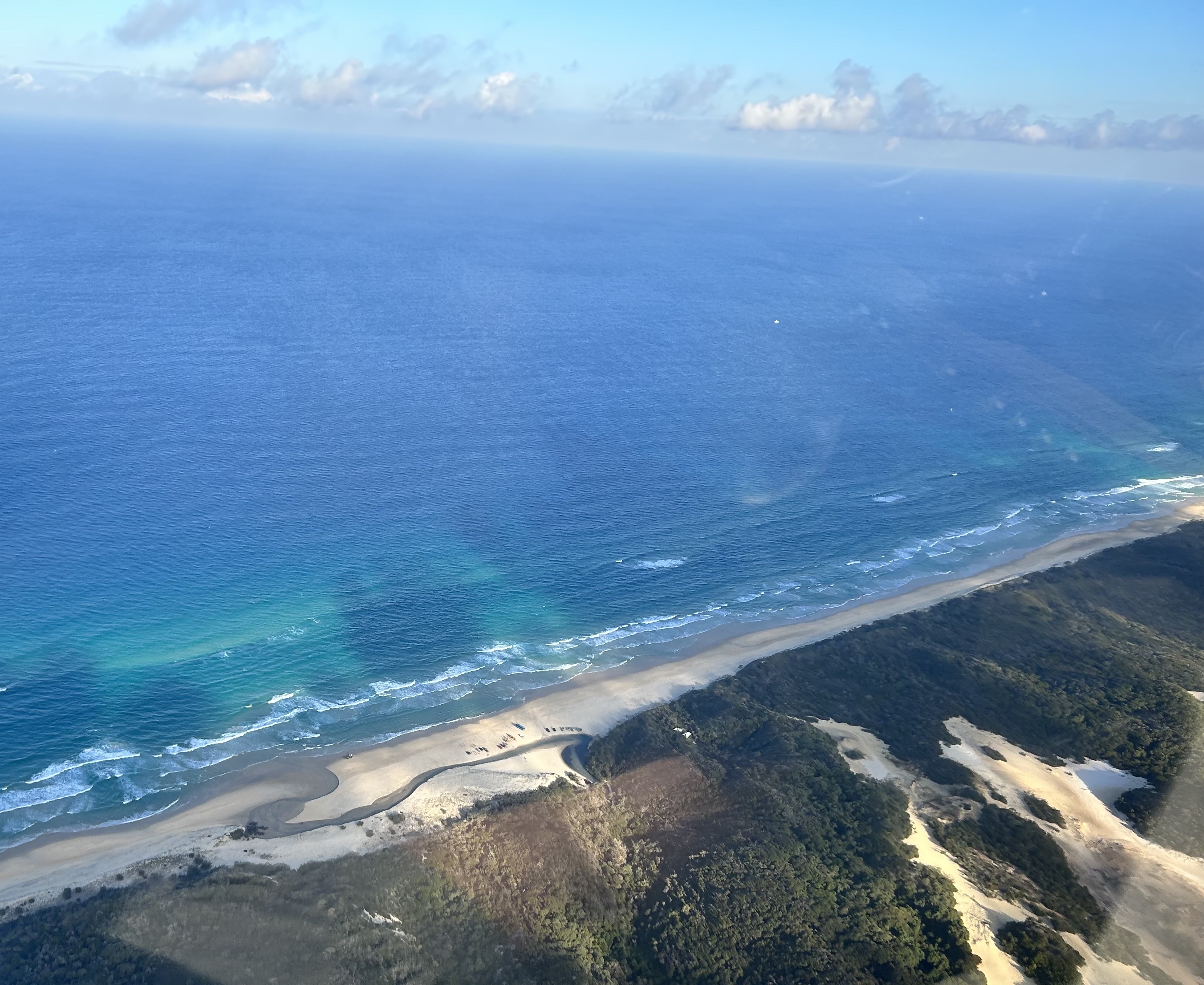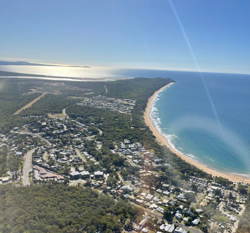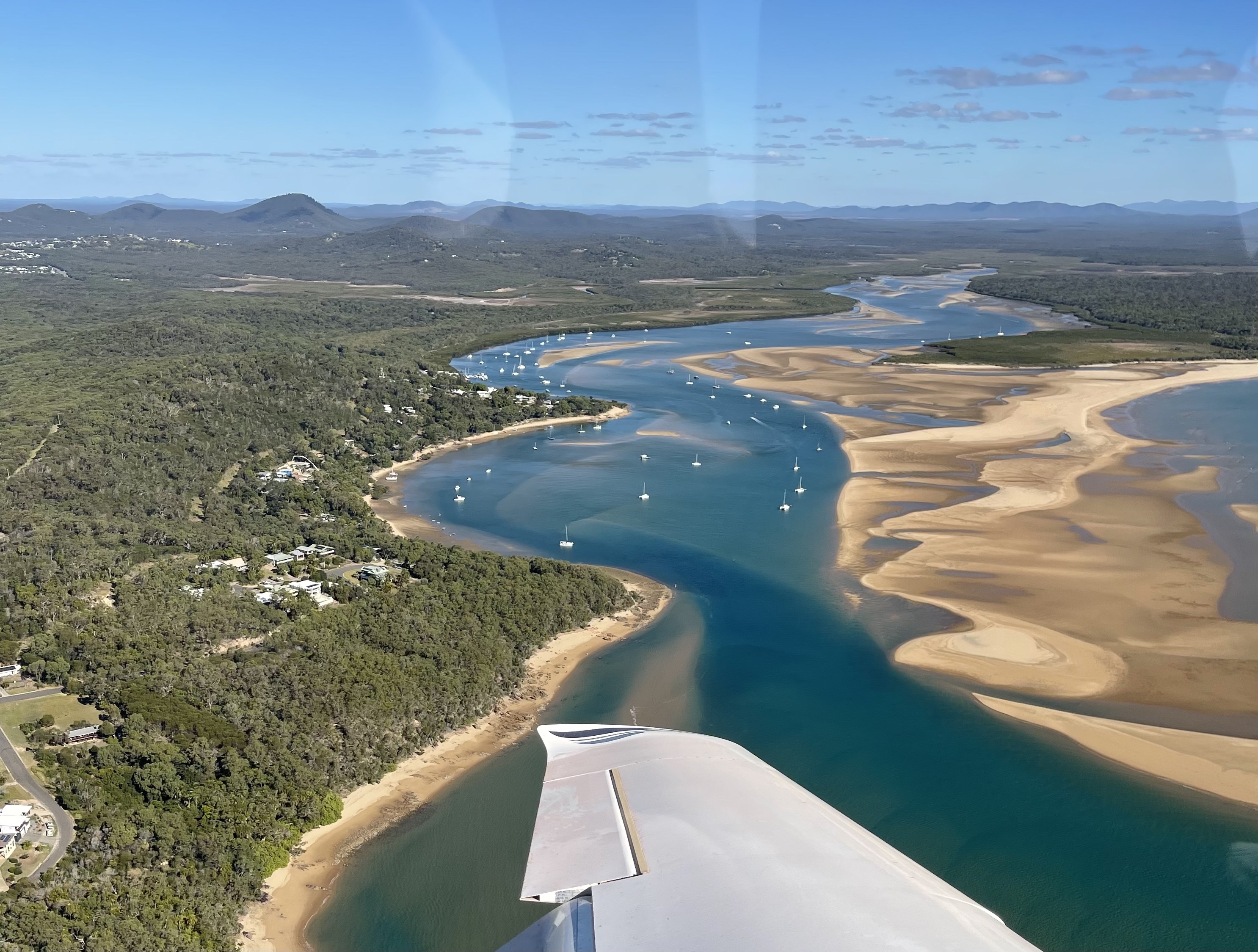 Taking to the air again we tracked for K’gari Fraser Island and flew down the coast at 2000ft past Cathedral Beach, Ely Creek, Eurong and on to Double Island Point before reaching Noosa. A Virgin 737 was taking off from Sunny Coast so we had to fly over the top of the airport to avoid his wake turbulence then on past Caloundra and over Bribie Island to Redcliffe.