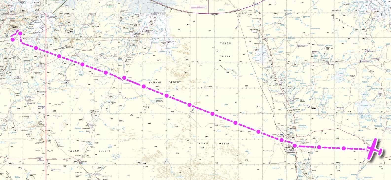 From Purnululu it was a “long haul” flight to Barkly Wayside Inn via Hooker Creek and Tennant Creek. We did a quick pass over the Bungles and then tracked direct for YHOO, losing 90 minutes as we crossed into the NT.