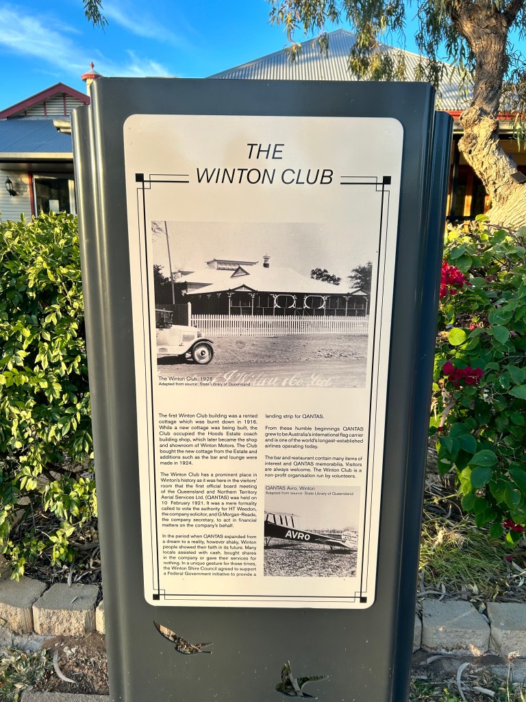 ur Kimberley Krusade was drawing to an end and it really was time to head for home. Another cold morning start at Winton meant we had time to observe the feeding of the Brolgas at the Outback Motel and do a quick walk around town before breakfast. We checked out the Winton Club, site of the first QANTAS board meeting.