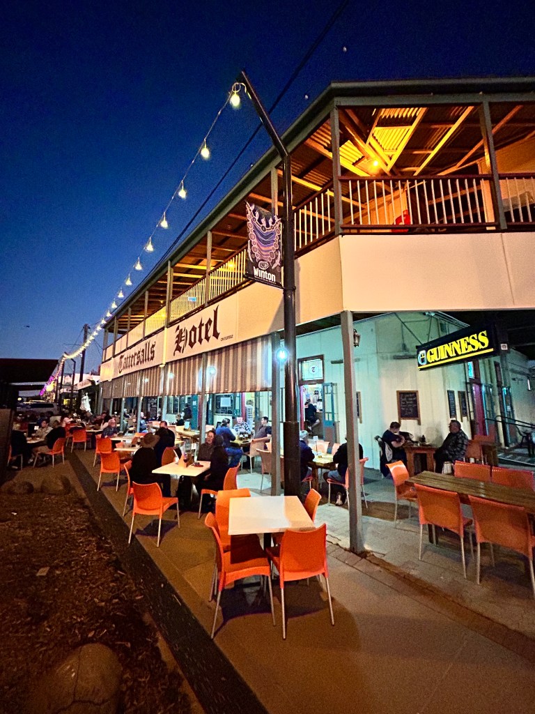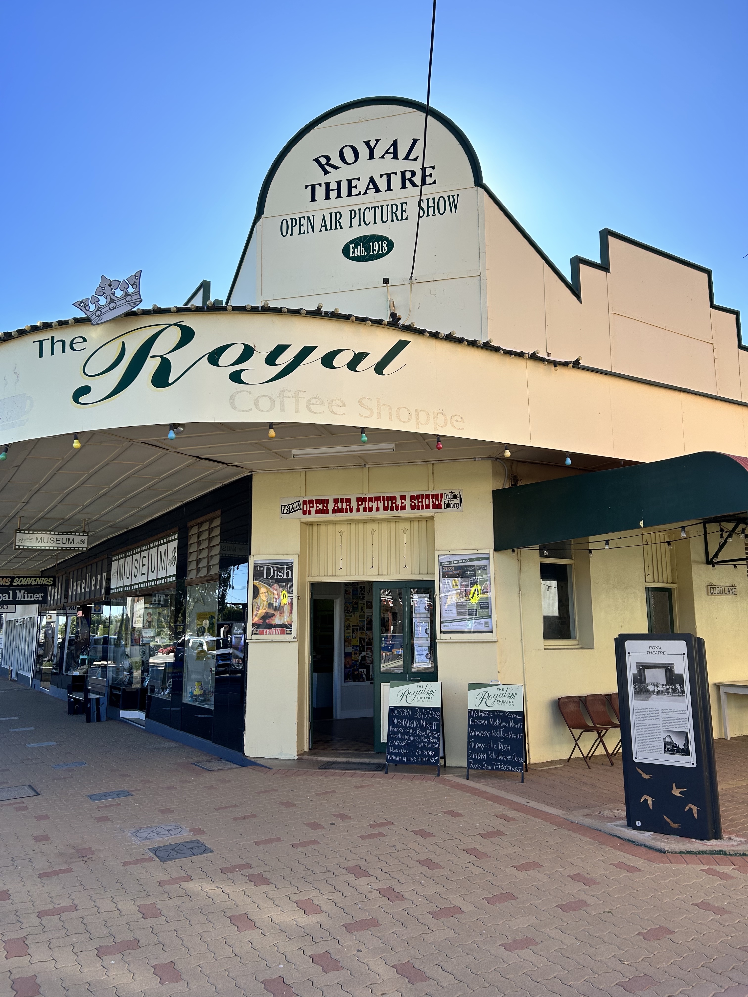 After another RNP approach we tied down for the night. Adam from the Outback Motel was waiting for us and before long we were taking in the wonders of Winton. There was a poetry recital by Gregory North at the North Gregory Hotel followed by dinner at the Tatts Hotel as the sun set. We finished the day with a nostalgic movie night at the open air Royal Theatre. It’s one of only two open air cinemas in Australia. Where’s the other one? You guessed it – Broome. As the temperature dropped to 10 degrees we watched newsreels from the 50s, old adverts, cartoons and silent movie skits. Very funny. And we could remember many of them from our childhoods.