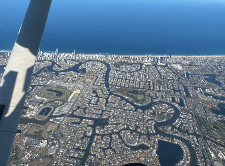 Approaching the Gold Coast I called up Brisbane Centre and obtained a squawk code, and we were identified, told to remain OCTA and to contact Gold Coast Tower abeam Q1. There were a few other aircraft around as we headed south and we were asked by Gold Coast to head inland to Robina Town Centre and follow the inland VFR route due to traffic. Nevertheless this gave us a great view of the coast and the hills to the west, and we were soon over the Tweed River and out of the controlled airspace.