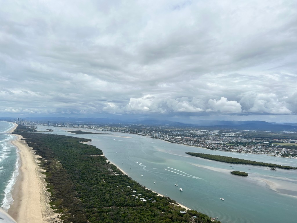 The day started off looking fairly unpromising. Low cloud and showers of rain. But it was forecast to improve during the morning and clear in the afternoon so we delayed our departure time a bit and took off from Redcliffe around 9:30, passing over Moreton Island and Straddy on our way to the Gold Coast. I volunteered to do the radios to give Garry more time to enjoy the flying and the views.