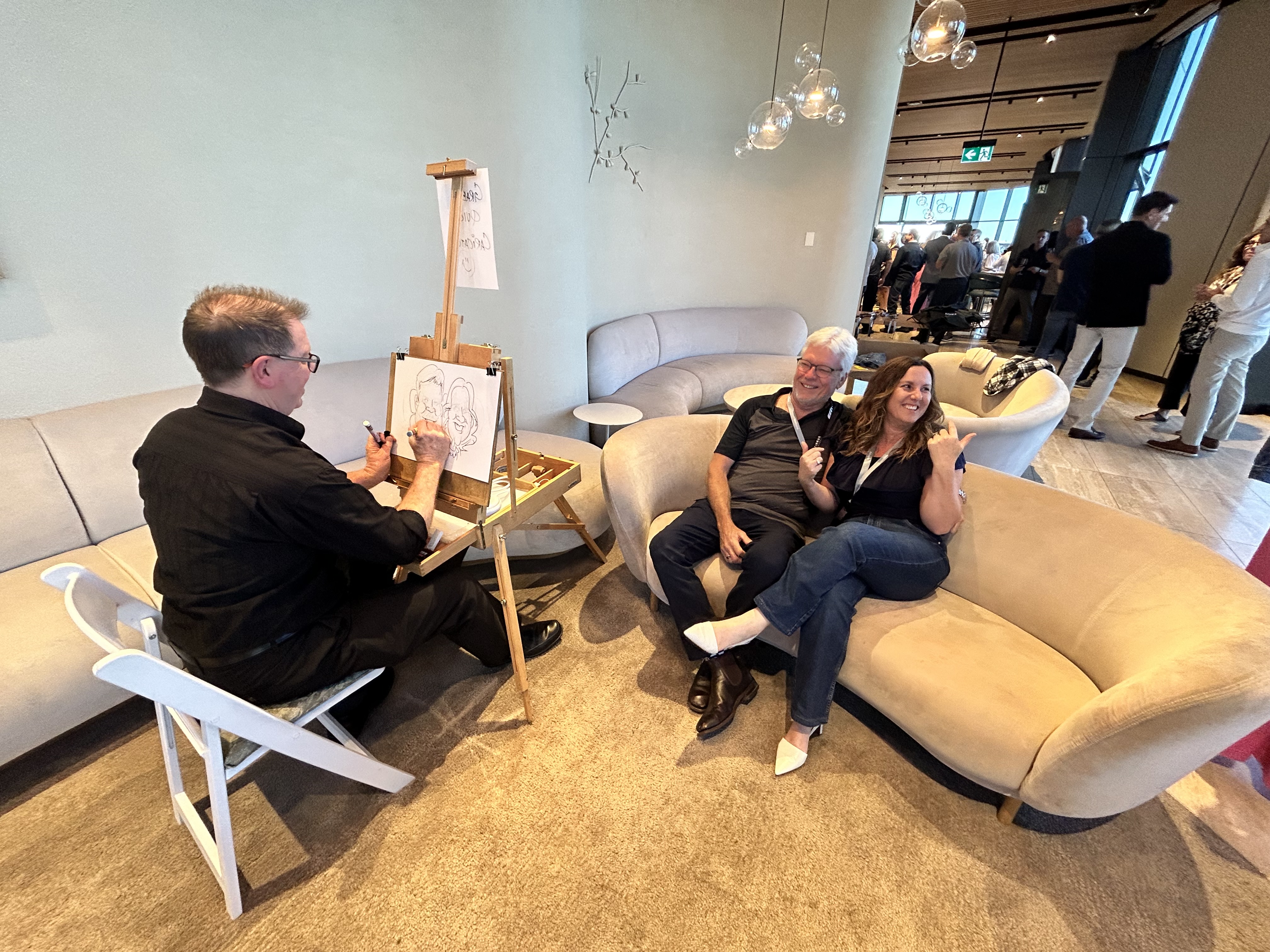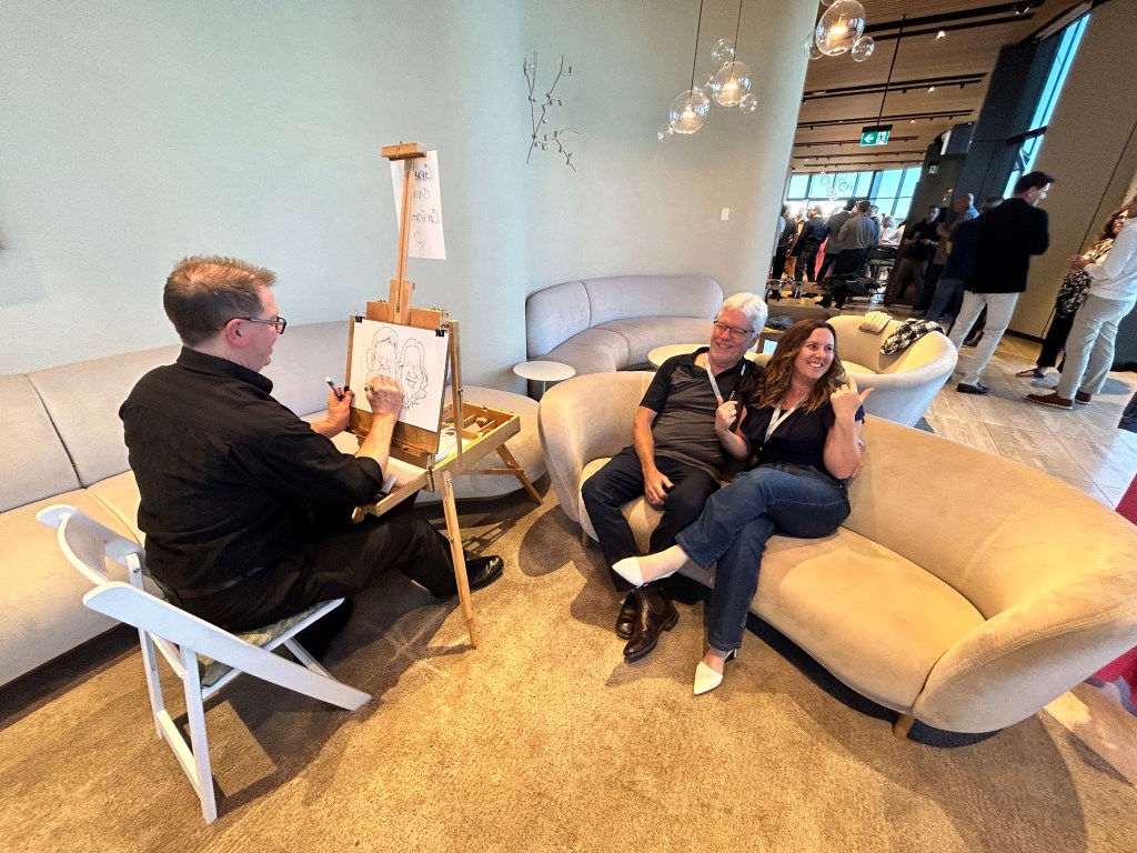 Touching down in Adelaide around 10am we were met by the Cirrus team who transported us to the Eos by SkyCity Hotel in North Terrace, just next to the Casino and across the river from Adelaide Oval. The event kick off was the Friday evening cocktail party. Approximately 150 people filled the rooftop terrace of the Eos by SkyCity Hotel. This venue gave everyone the opportunity to view the city of Adelaide and the Adelaide Oval from a high vantage point and to mix and mingle with old friends. An artist who did instant caricature sketches added a bit of fun.