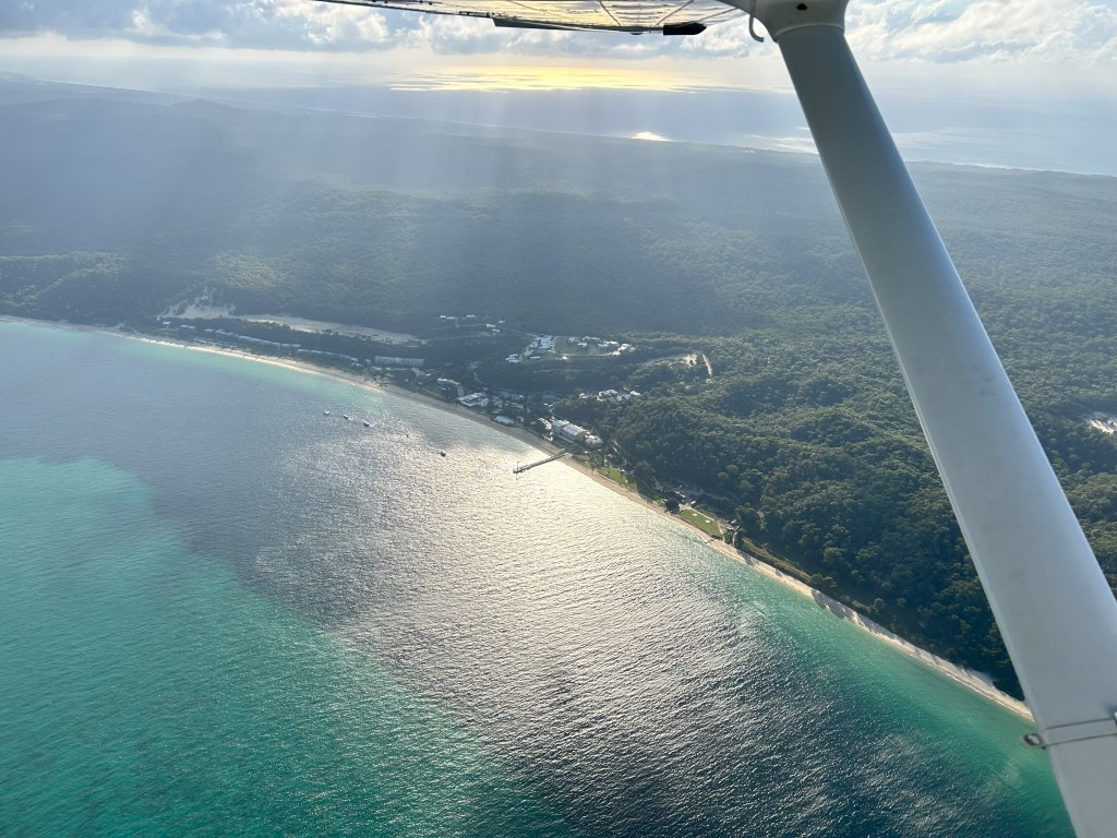 After topping up with fuel we departed at 7:30, crossing over to Moreton Island and flew past Tangalooma Resort.