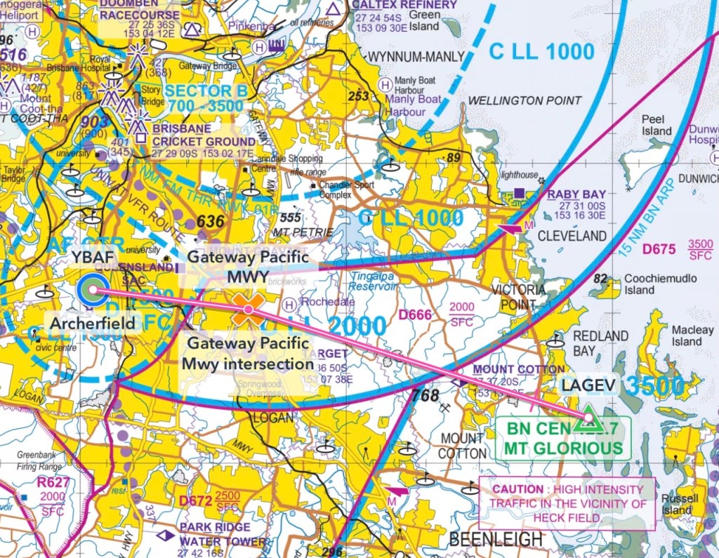 Our first flight was to be in the training area over the southern end of Moreton Bay so we taxied to RWY10L and were cleared for an eastern departure. Rob had explained that he’d take off and land and I could fly the plane the rest of the time except when he was demonstrating a procedure. A Cessna Citation took off before us so we gave him a bit of time to climb out to avoid his wake turbulence. Then Rob applied power and I was pushed back in the seat as the plane accelerated and climbed away. We rotated prior to the Citations’s rotation point and climbed at about 20 degrees so we’d remain above his flight path and wake.