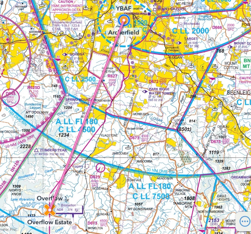 Soon we were off to the threshold of RWY28R, this time for the southern training area towards Beaudesert and Rob requested a “Greenbank Departure”. This entailed flying over the Greenbank army firing range so after taking off and turning right we maintained 1500ft until we left the Archerfield control zone. Rob handed over to me and I climbed quickly to 2300ft before we reached the edge of the firing range. Apparently their bullets can only reach 2000ft so we’d be fine at 2300 if they were firing!