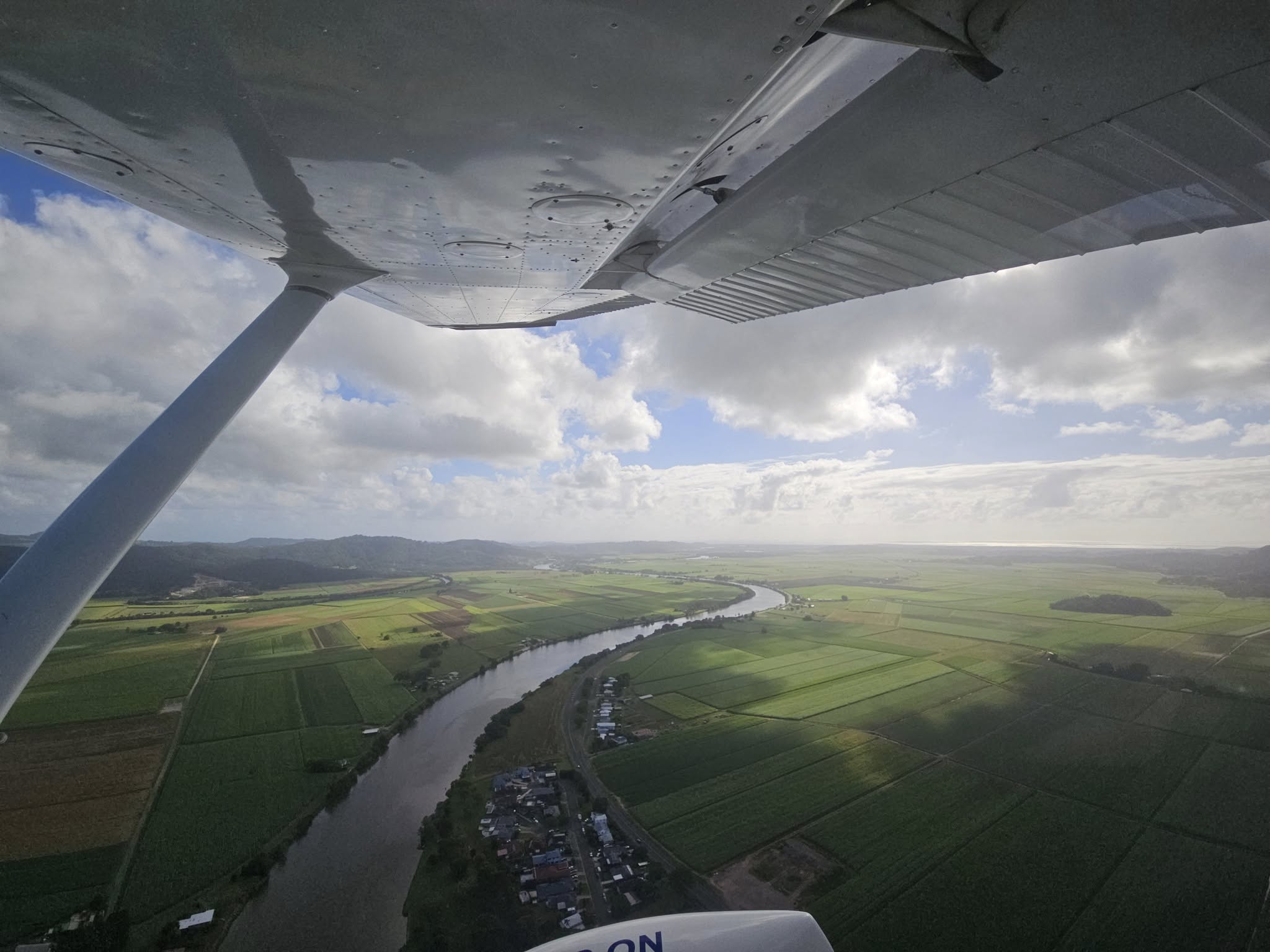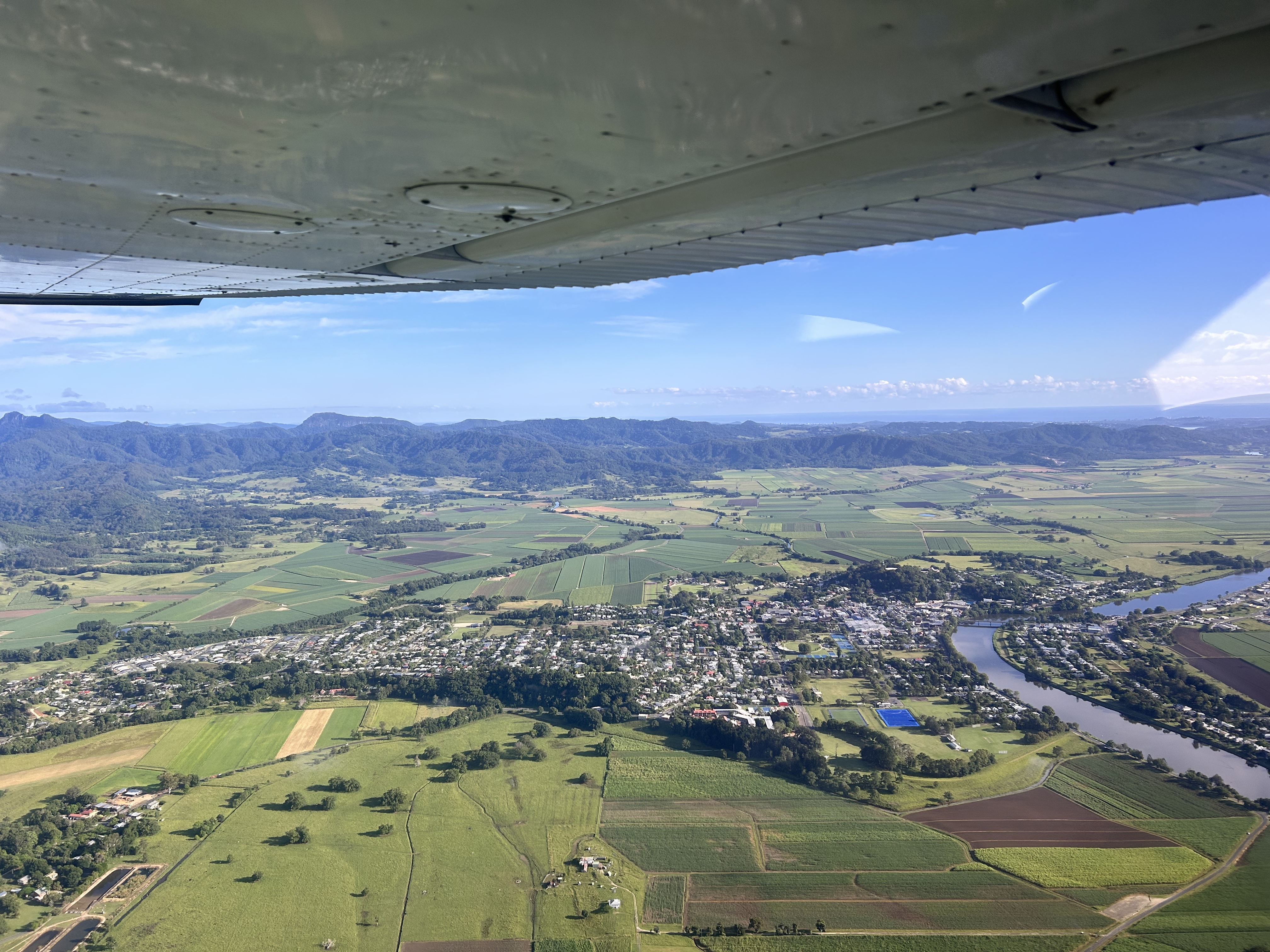 Six days later it was a beautiful morning for a flight so first thing, accompanied by Marty Jackson, I took RYC up for another familiarisation/scenic flight out of Murwillumbah past Mount Warning, Nimbin, Mullumbimby and Pottsville. First we passed over Murwillumbah and the Tweed River.