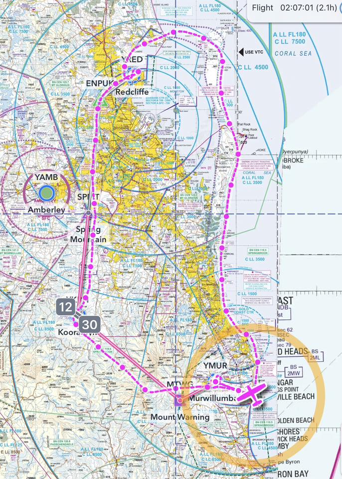 From Moree it was 90 minutes to Redcliffe, passing over miles and miles of green pastures, a new wind farm still under construction, Texas, Warwick, Cunningham’s Gap and Amberley. A C17 Globemaster was doing circuits at Amberley below us so, even though we were at 7000 feet, ATC guided us to the north of their airspace.